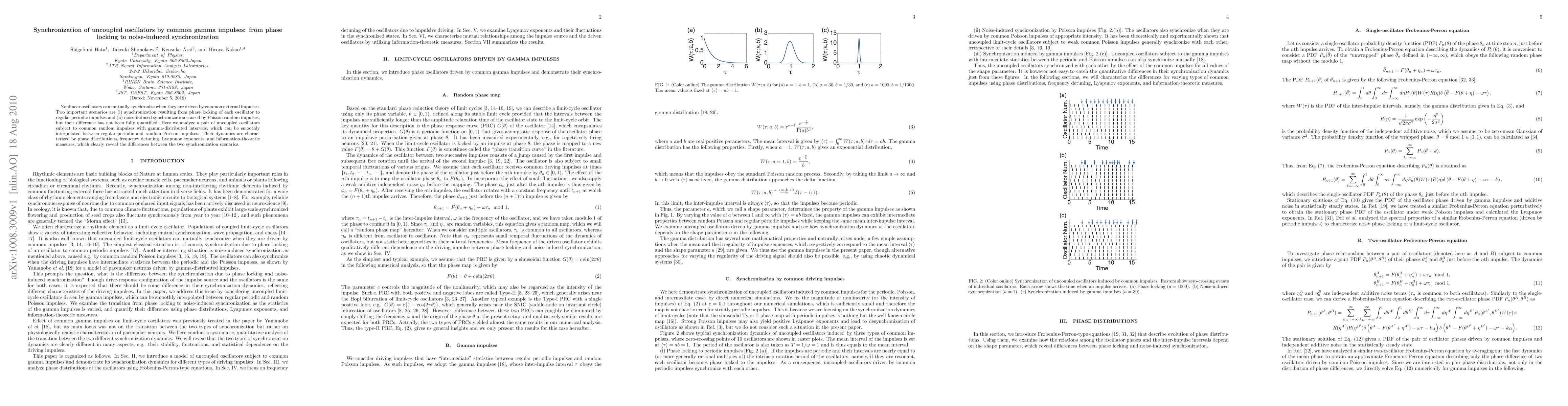 This paper investigates the synchronization of uncoupled oscillators driven by common gamma-distributed impulses, analyzing both phase locking to regular periodic impulses and noise-induced synchronization from Poisson random impulses. The study reveals distinct dynamics through phase distributions, frequency detuning, Lyapunov exponents, and information-theoretic measures.