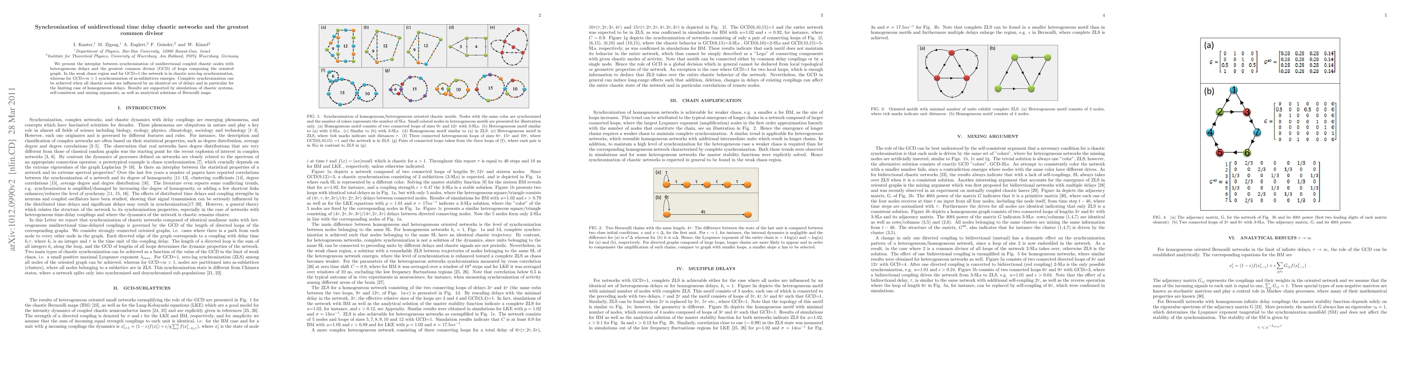 We present the interplay between synchronization of unidirectional coupled chaotic nodes with heterogeneous delays and the greatest common divisor (GCD) of loops composing the oriented graph. In the weak chaos region and for GCD=1 the network is in chaotic zero-lag synchronization, whereas for GCD=m>1 synchronization of m-sublattices emerges. Complete synchronization can be achieved when all chaotic nodes are influenced by an identical set of delays and in particular for the limiting case of homogeneous delays. Results are supported by simulations of chaotic systems, self-consistent and mixing arguments, as well as analytical solutions of Bernoulli maps.