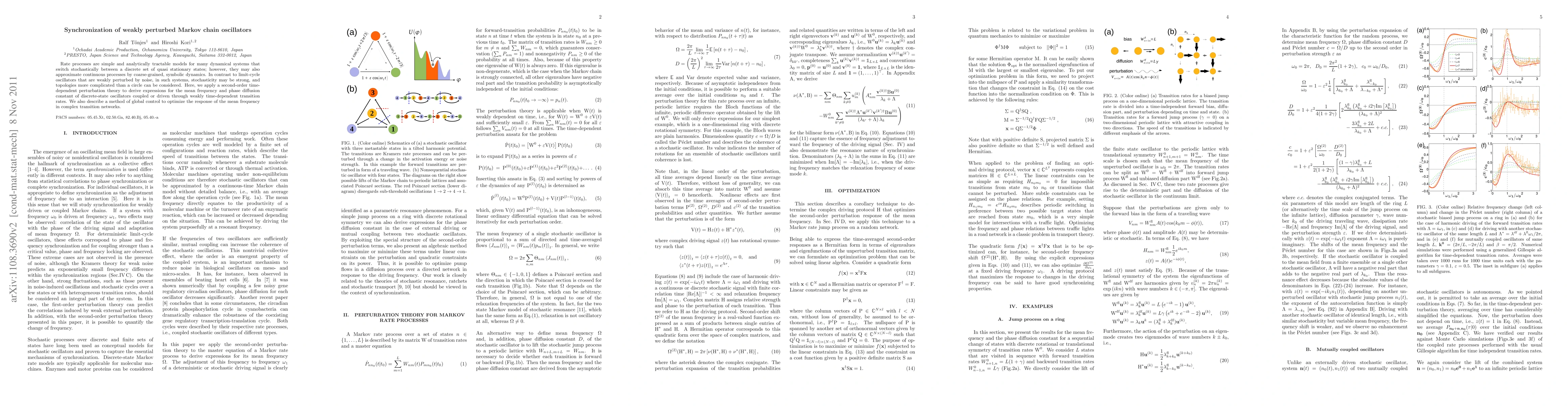 This paper develops a second-order perturbation theory to analyze the synchronization of weakly perturbed Markov chain oscillators, deriving expressions for mean frequency and phase diffusion. It also proposes a global control method to optimize mean frequency response in complex transition networks.