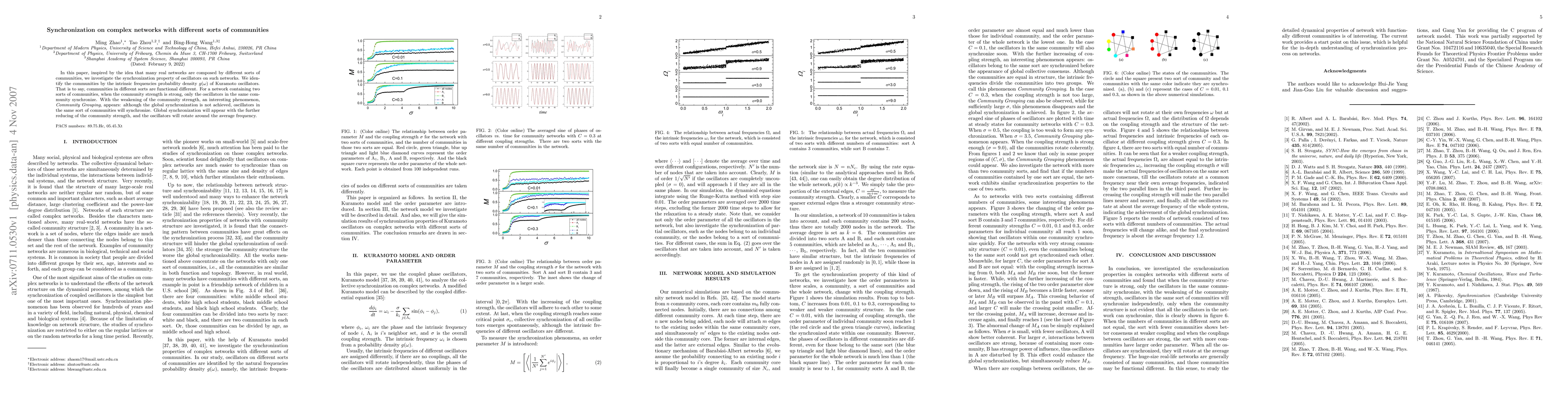 Researchers studied how oscillators synchronize on networks with different communities, finding that global synchronization occurs as community strength decreases, but oscillators within the same community type synchronize first.