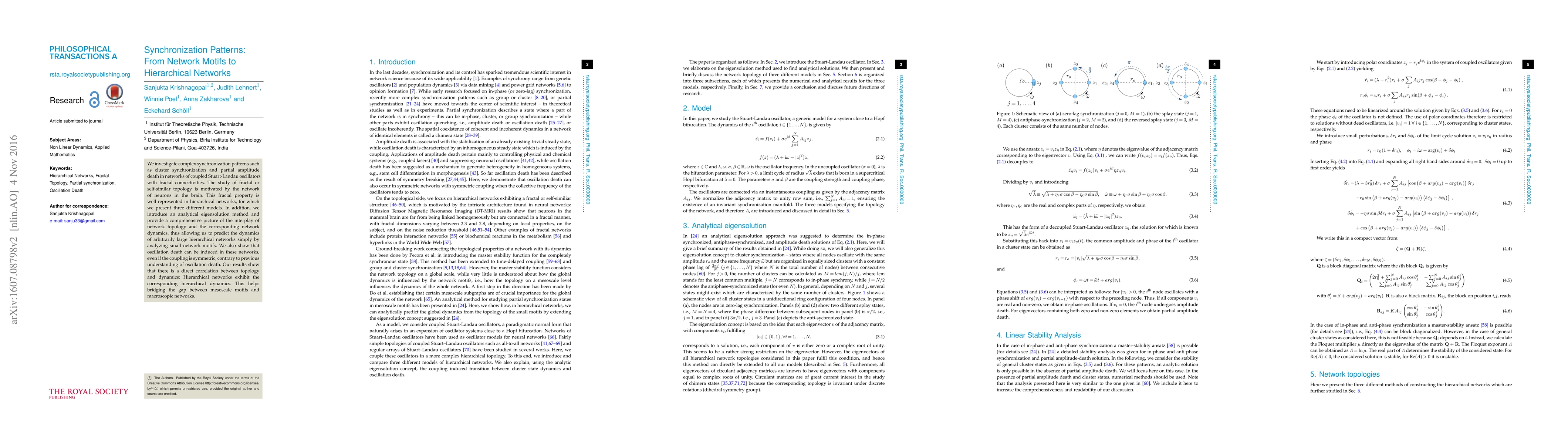 The paper extends the eigensolution concept to hierarchical networks, demonstrating that the fractal nature of network topology translates to fractal synchronization patterns, and establishes a second mechanism for oscillation death in symmetrically coupled networks.