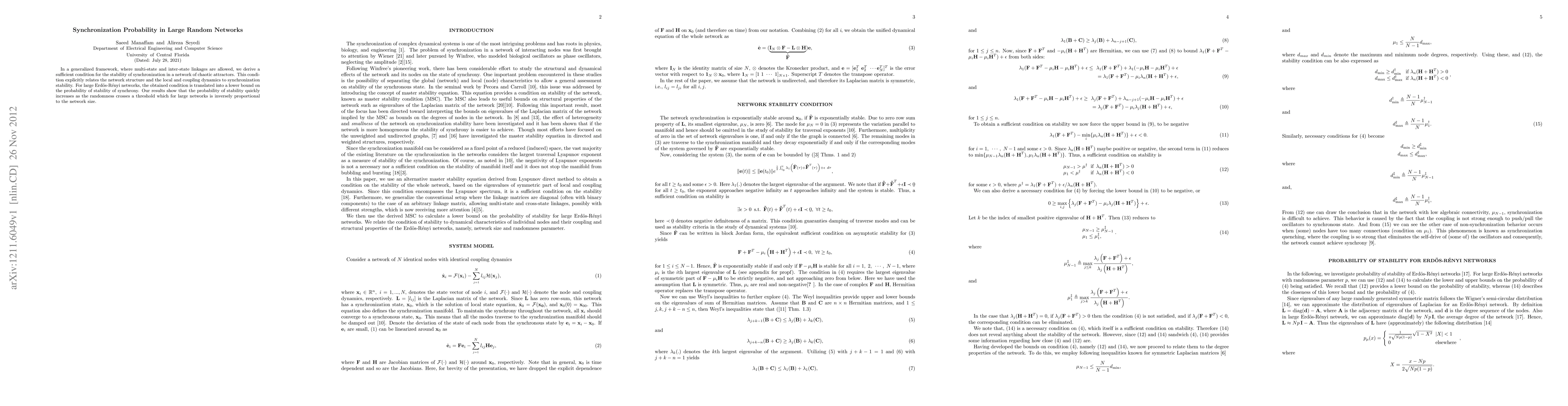 In a generalized framework, where multi-state and inter-state linkages are allowed, we derive a sufficient condition for the stability of synchronization in a network of chaotic attractors. This condition explicitly relates the network structure and the local and coupling dynamics to synchronization stability. For large Erd\"{o}s-R\'{e}nyi networks, the obtained condition is translated into a lower bound on the probability of stability of synchrony. Our results show that the probability of stability quickly increases as the randomness crosses a threshold which for large networks is inversely proportional to the network size.