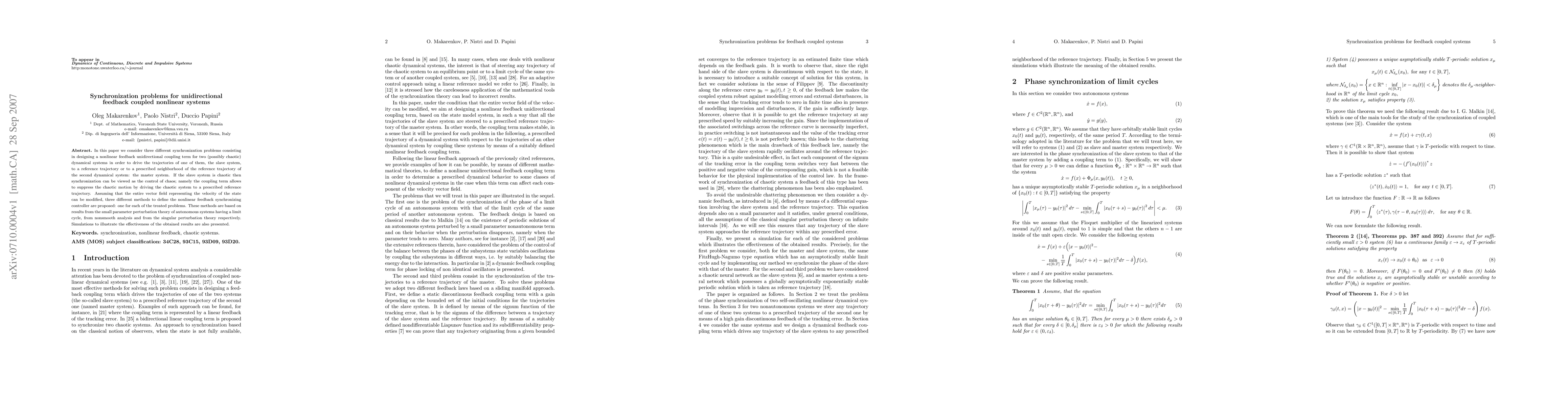 In this paper we consider three different synchronization problems consisting in designing a nonlinear feedback unidirectional coupling term for two (possibly chaotic) dynamical systems in order to drive the trajectories of one of them, the slave system, to a reference trajectory or to a prescribed neighborhood of the reference trajectory of the second dynamical system: the master system. If the slave system is chaotic then synchronization can be viewed as the control of chaos; namely the coupling term allows to suppress the chaotic motion by driving the chaotic system to a prescribed reference trajectory. Assuming that the entire vector field representing the velocity of the state can be modified, three different methods to define the nonlinear feedback synchronizing controller are proposed: one for each of the treated problems. These methods are based on results from the small parameter perturbation theory of autonomous systems having a limit cycle, from nonsmooth analysis and from the singular perturbation theory respectively. Simulations to illustrate the effectiveness of the obtained results are also presented.