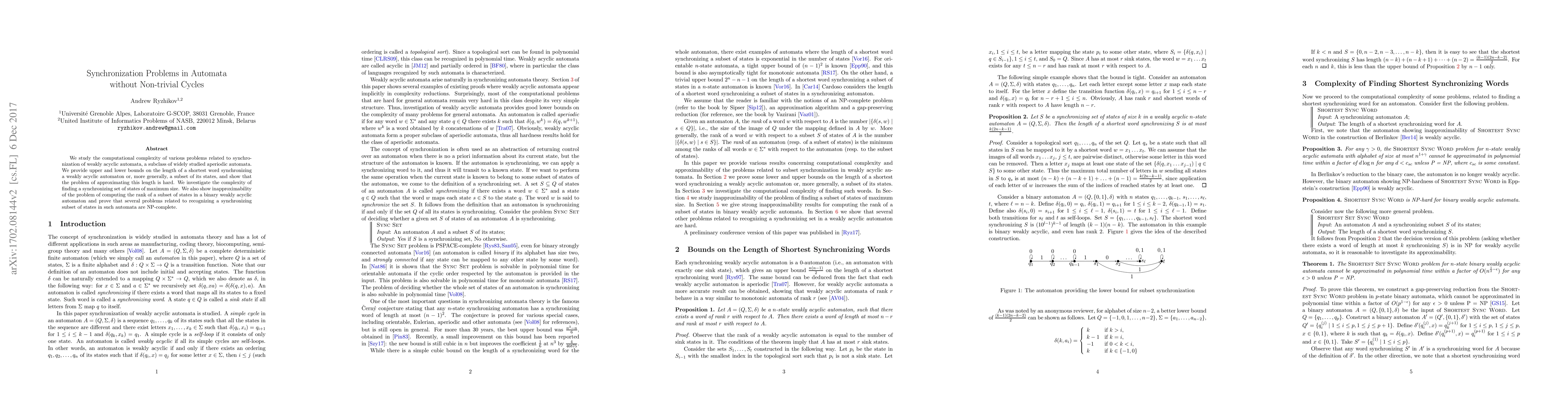 This paper explores the computational complexity of synchronization problems in weakly acyclic automata, establishing upper and lower bounds for the length of synchronizing words, and proving the inapproximability of related problems. It also demonstrates the NP-completeness of several recognition problems for synchronizing subsets in these automata.
