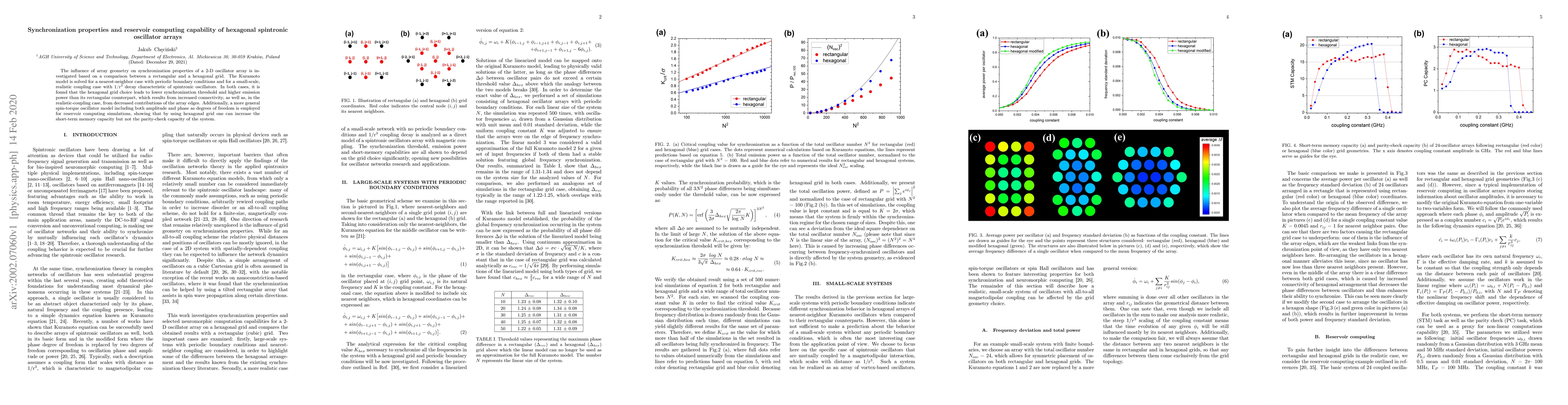 This paper investigates the synchronization properties of hexagonal versus rectangular spintronic oscillator arrays, finding that hexagonal grids exhibit lower synchronization thresholds and higher emission power. Additionally, hexagonal grids enhance short-term memory capacity in reservoir computing simulations but do not improve parity-check capacity.