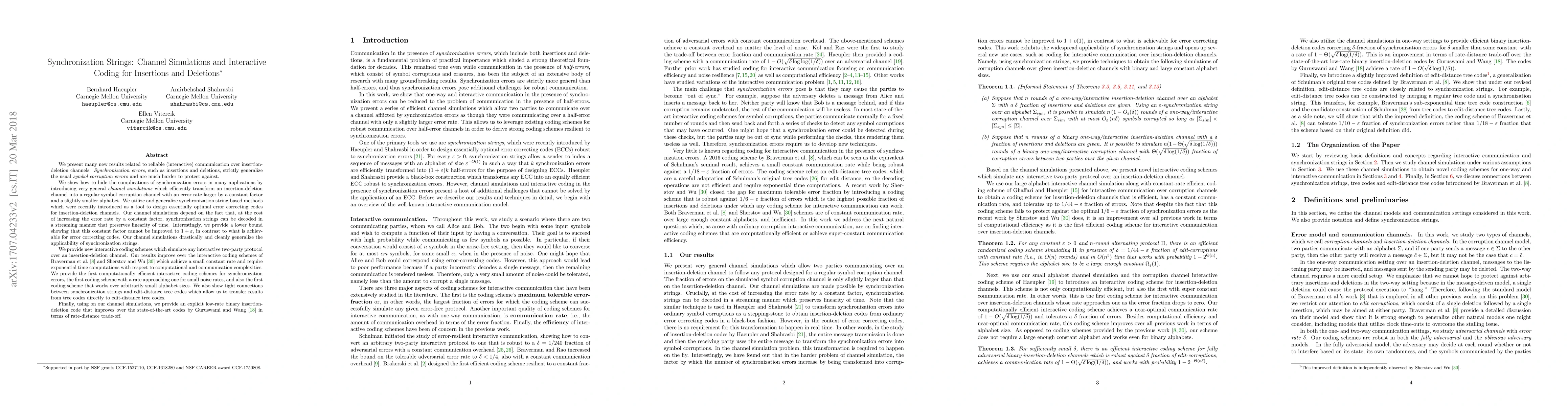 The paper presents new results on reliable (interactive) communication over insertion-deletion channels using synchronization strings, channel simulations, and interactive coding schemes.