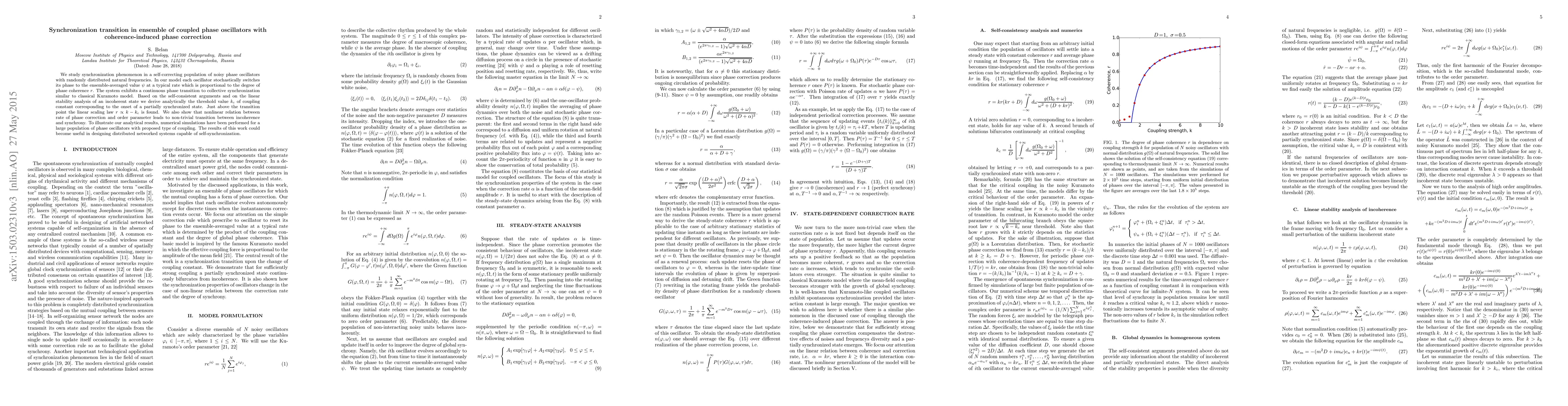 This paper explores synchronization in a population of phase oscillators where each oscillator corrects its phase to the ensemble average, leading to a continuous transition to collective synchronization. Analytical and numerical results reveal a critical coupling threshold for partial synchronization, with implications for designing self-synchronizing networked systems.