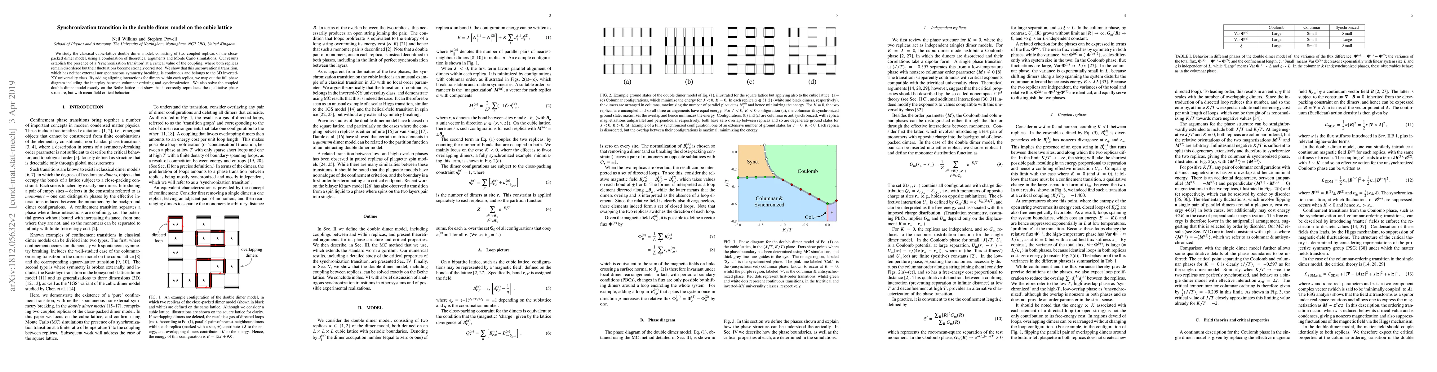 This paper investigates the double dimer model on a cubic lattice, revealing a 'synchronization transition' at a critical coupling strength where replicas' fluctuations become correlated without symmetry breaking. The transition is continuous and belongs to the 3D inverted-XY universality class, and the full phase diagram includes columnar ordering and synchronization effects.