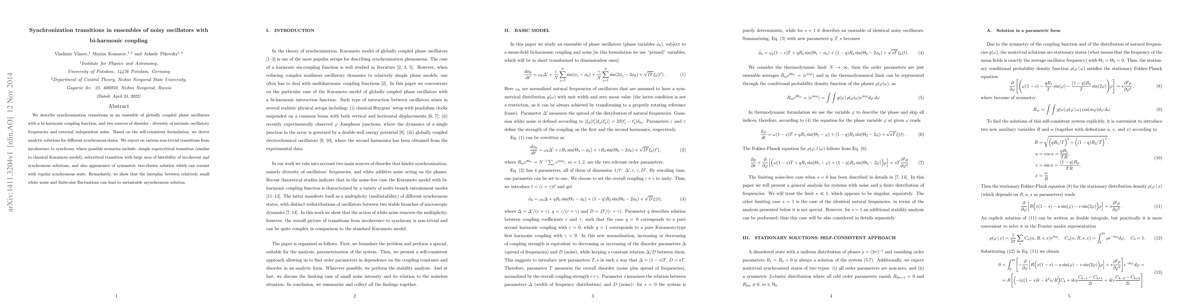 This paper explores synchronization transitions in ensembles of phase oscillators with bi-harmonic coupling and disorder, deriving analytic solutions for different synchronous states. It identifies various non-trivial transitions, including supercritical, subcritical, and two-cluster solutions, and highlights how noise can lead to metastable asynchronous states.