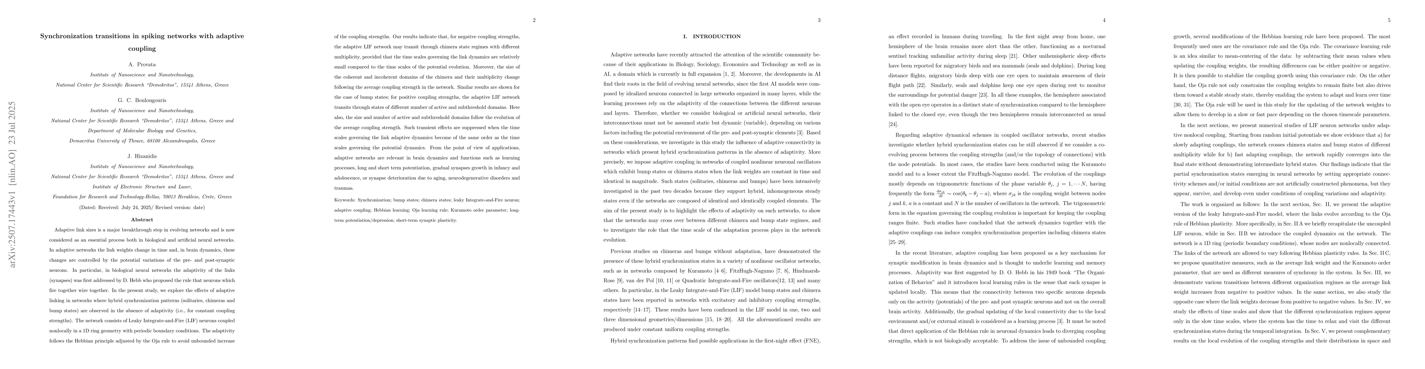 Adaptive link sizes is a major breakthrough step in evolving networks and is now considered as an essential process both in biological and artificial neural networks. In adaptive networks the link weights change in time and, in brain dynamics, these changes are controlled by the potential variations of the pre- and post-synaptic neurons. In particular, in biological neural networks the adaptivity of the links (synapses) was first addressed by D. Hebb who proposed the rule that neurons which fire together wire together. In the present study, we explore the effects of adaptive linking in networks where hybrid synchronization patterns (solitaries, chimeras and bump states) are observed in the absence of adaptivity (i.e., for constant coupling strengths). The network consists of Leaky Integrate-and-Fire (LIF) neurons coupled nonlocally in a 1D ring geometry. The adaptivity follows the Hebbian principle adjusted by the Oja rule to avoid unbounded increase of the coupling strengths. Our results indicate that, for negative coupling strengths, the adaptive LIF network may transit through chimera state regimes with different multiplicity, provided that the time scales governing the link dynamics are relatively small compared to the time scales of the potential evolution. Moreover, the size of the coherent and incoherent domains of the chimera and their multiplicity change following the average coupling strength in the network. Similar results are shown for the case of bump states: for positive coupling strengths, the adaptive LIF network transits through states of different number of active and subthreshold domains. The size and number of these domains also follow the evolution of the average coupling strength. Such transient effects are suppressed when the time scales governing the link adaptive dynamics become of the same order as the time scales governing the potential dynamics.