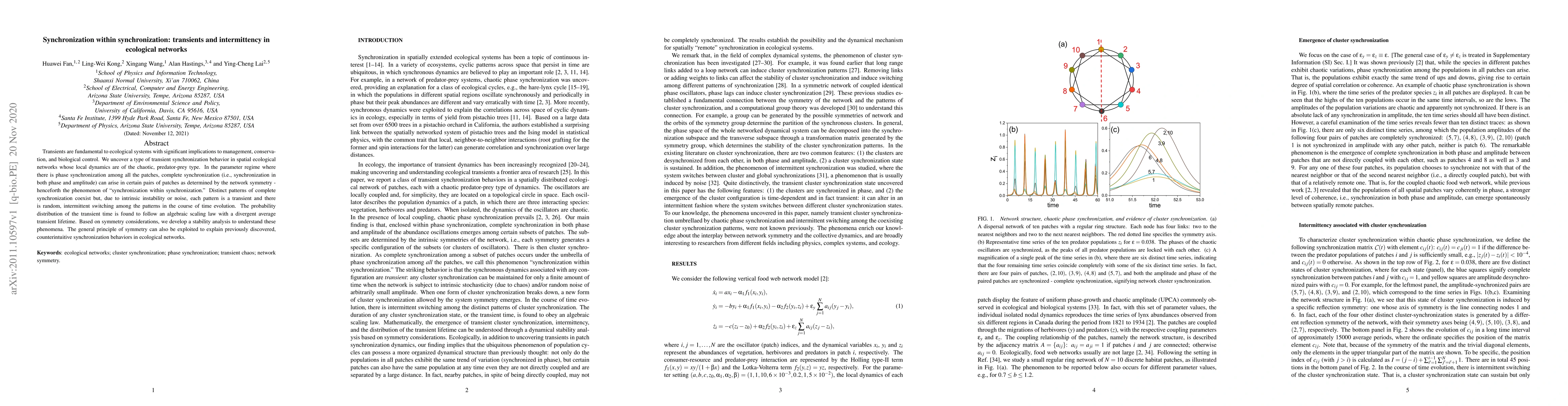 This paper explores transient synchronization in chaotic ecological networks, revealing "synchronization within synchronization" where distinct patterns of complete synchronization emerge and intermittently switch due to network symmetry and intrinsic instability. The study develops a stability analysis based on symmetry and finds an algebraic scaling law for the transient time distribution.
