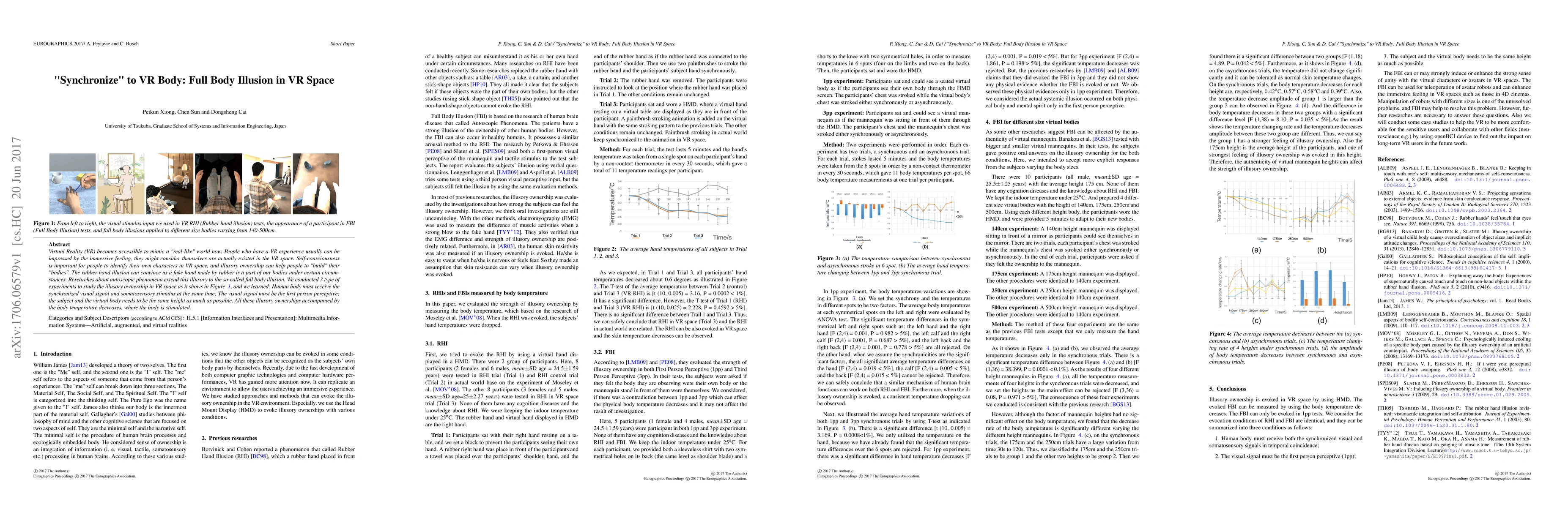 This paper explores the conditions for creating a full body illusion in VR, demonstrating that synchronized visual and somatosensory stimuli, first-person perspective, and matching virtual body height enhance illusory ownership. These conditions lead to a decrease in body temperature in the stimulated area.