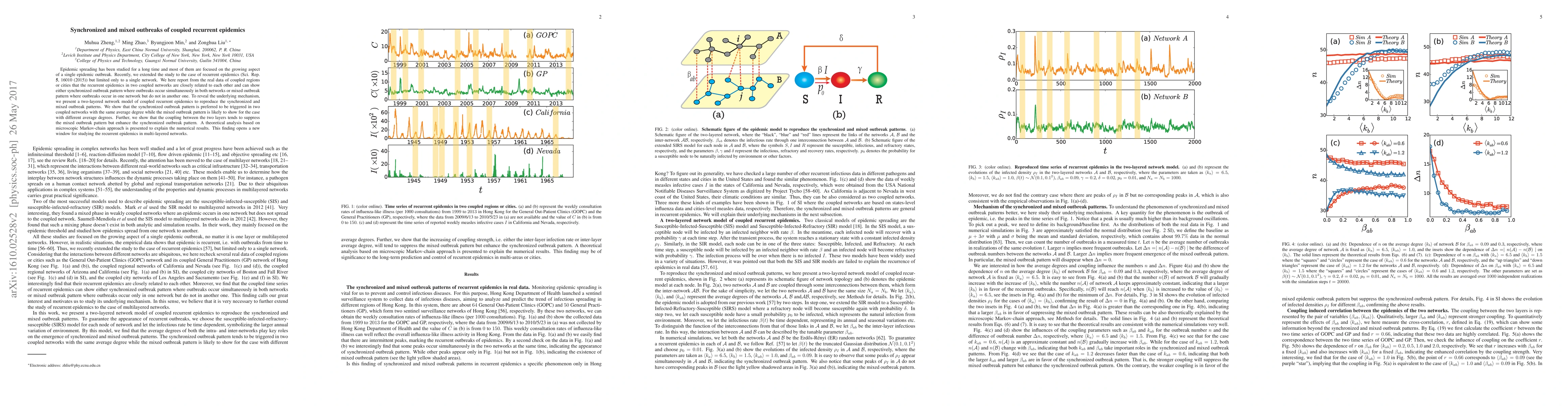 This paper investigates synchronized and mixed outbreaks of recurrent epidemics in two coupled networks using real data from coupled regions or cities. It presents a two-layered network model to reproduce these outbreak phases, showing that synchronized outbreaks occur in networks with similar average degrees, while mixed outbreaks are favored when average degrees differ. The study concludes that coupling between networks enhances synchronized outbreaks and suppresses mixed outbreaks, offering new insights into recurrent epidemics in multi-layered networks.