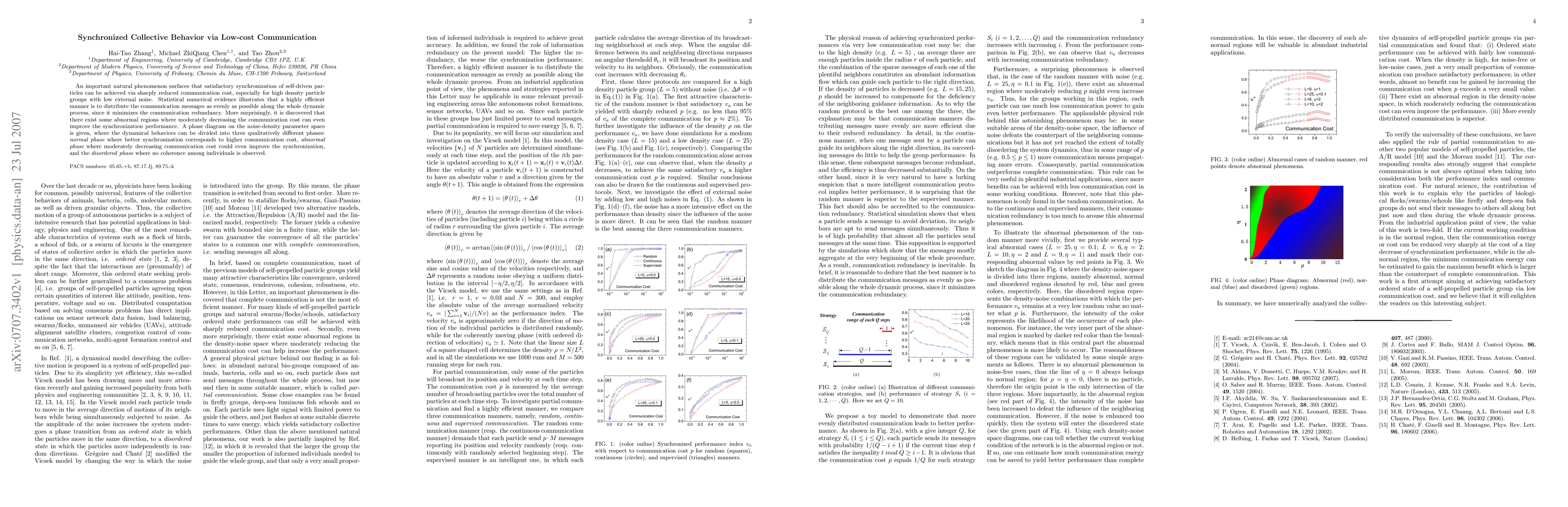 An important natural phenomenon surfaces that satisfactory synchronization of self-driven particles can be achieved via sharply reduced communication cost, especially for high density particle groups with low external noise. Statistical numerical evidence illustrates that a highly efficient manner is to distribute the communication messages as evenly as possible along the whole dynamic process, since it minimizes the communication redundancy. More surprisingly, it is discovered that there exist some abnormal regions where moderately decreasing the communication cost can even improve the synchronization performance. A phase diagram on the noise-density parameter space is given, where the dynamical behaviors can be divided into three qualitatively different phases: normal phase where better synchronization corresponds to higher communication cost, abnormal phase where moderately decreasing communication cost could even improve the synchronization, and the disordered phase where no coherence among individuals is observed.