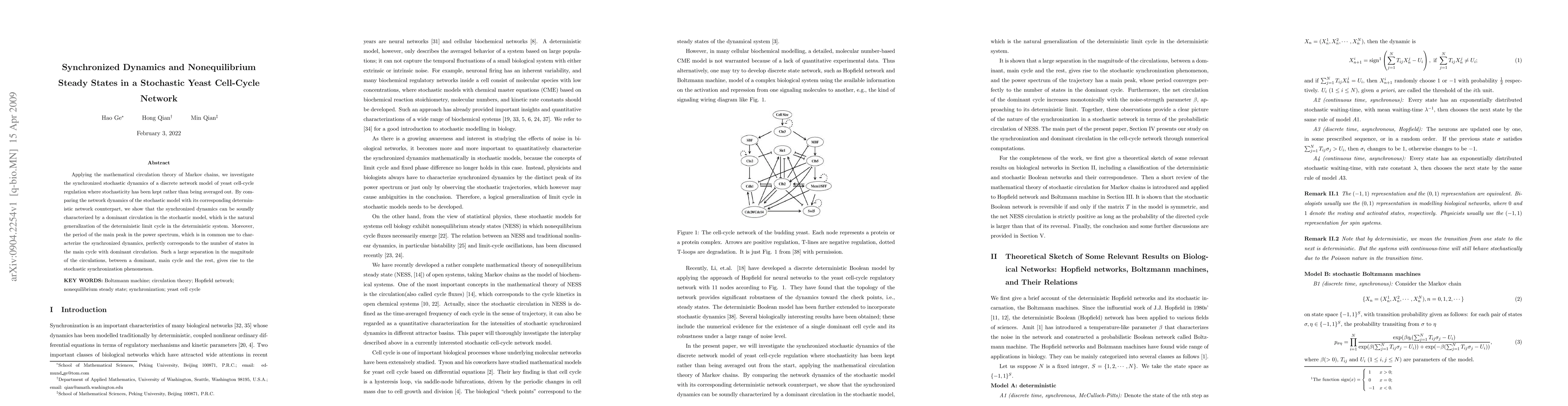 This paper uses Markov chain circulation theory to explore synchronized stochastic dynamics in a yeast cell-cycle network model, revealing that stochasticity leads to a dominant circulation characterizing synchronized dynamics, analogous to the deterministic limit cycle. The study finds a strong correlation between the main peak period in the power spectrum and the number of states in the dominant circulation cycle.