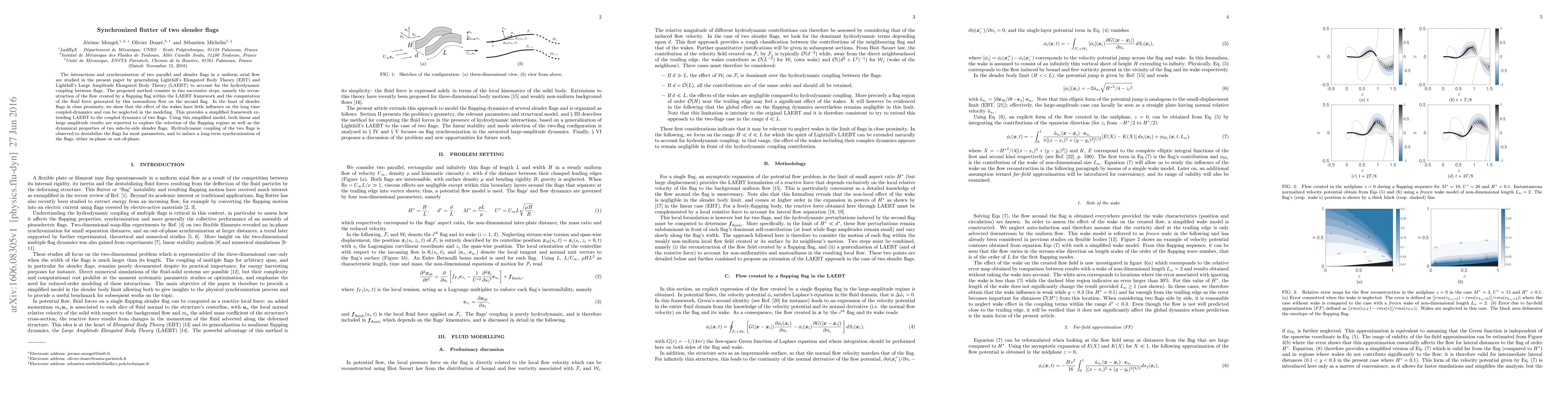 This paper explores the synchronized flutter dynamics of two parallel slender flags in a uniform flow, extending Lighthill's theories to account for hydrodynamic coupling. It shows that wake effects are negligible for slender flags, leading to a simplified model that reveals destabilization and synchronization of the flags due to coupling.
