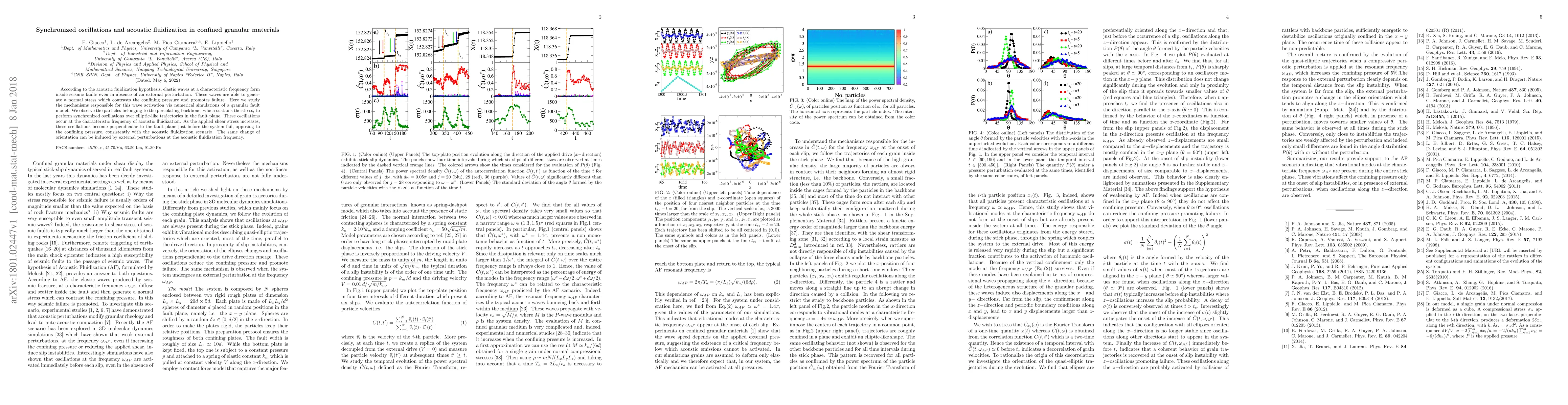 According to the acoustic fluidization hypothesis, elastic waves at a characteristic frequency form inside seismic faults even in the absence of an external perturbation. These waves are able to generate a normal stress which contrasts the confining pressure and promotes failure. Here, we study the mechanisms responsible for this wave activation via numerical simulations of a granular fault model. We observe the particles belonging to the percolating backbone, which sustains the stress, to perform synchronized oscillations over ellipticlike trajectories in the fault plane. These oscillations occur at the characteristic frequency of acoustic fluidization. As the applied shear stress increases, these oscillations become perpendicular to the fault plane just before the system fails, opposing the confining pressure, consistently with the acoustic fluidization scenario. The same change of orientation can be induced by external perturbations at the acoustic fluidization frequency.