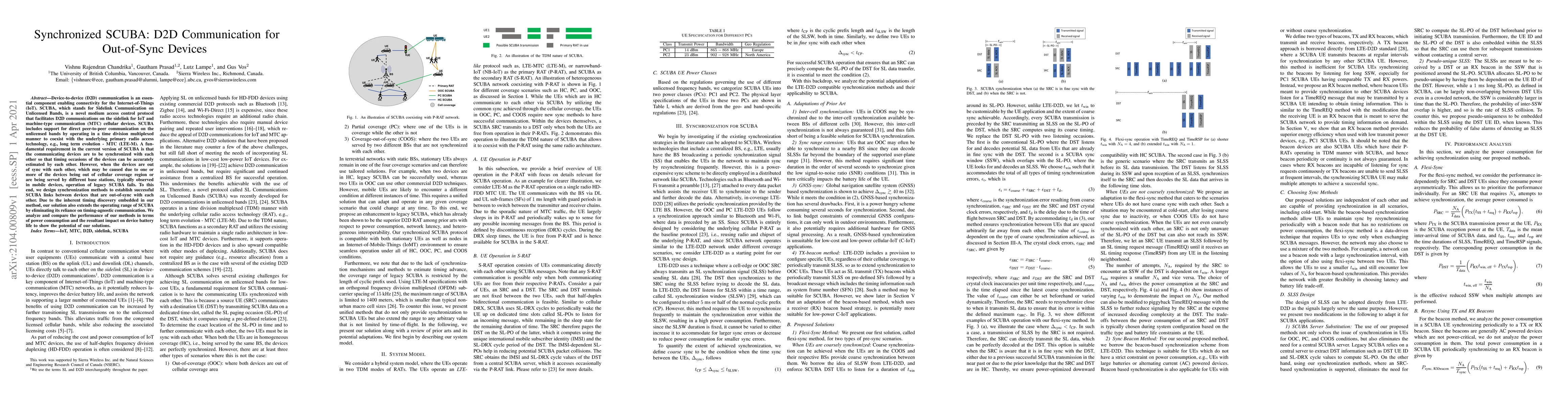 This paper proposes synchronization methods to enable successful D2D communication via SCUBA for IoT devices that are out-of-sync. The new approach enhances SCUBA's operational range and reduces reliance on timing-agnostic communication, while also analyzing power consumption and its impact on device battery life.