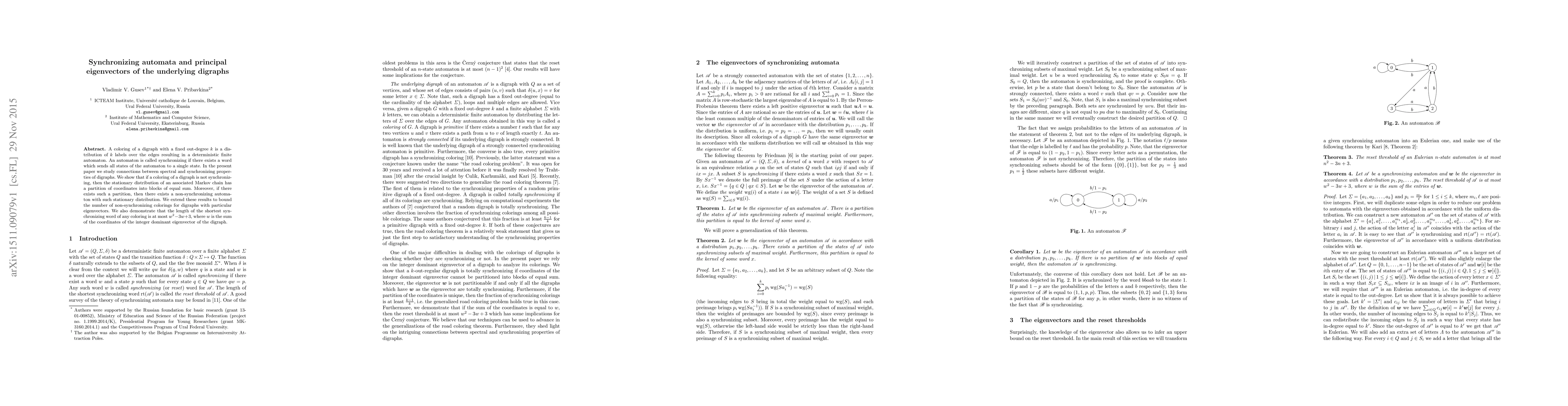 A coloring of a digraph with a fixed out-degree k is a distribution of k labels over the edges resulting in a deterministic finite automaton. An automaton is called synchronizing if there exists a word which sends all states of the automaton to a single state. In the present paper we study connections between spectral and synchronizing properties of digraphs. We show that if a coloring of a digraph is not synchronizing, then the stationary distribution of an associated Markov chain has a partition of coordinates into blocks of equal sum. Moreover, if there exists such a partition, then there exists a non-synchronizing automaton with such stationary distribution. We extend these results to bound the number of non-synchronizing colorings for digraphs with particular eigenvectors. We also demonstrate that the length of the shortest synchronizing word of any coloring is at most $w^2 - 3w + 3$, where $w$ is the sum of the coordinates of the integer principal eigenvector of the digraph.