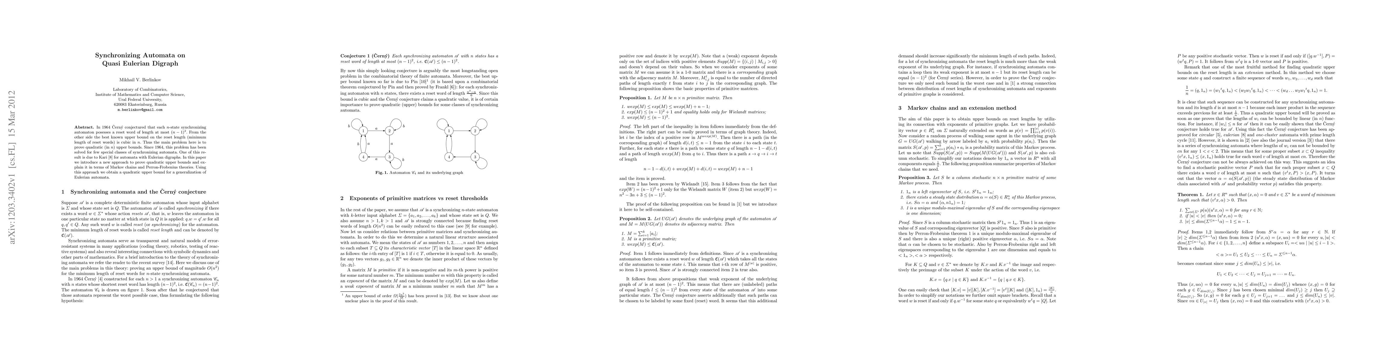 In 1964 \v{C}ern\'{y} conjectured that each $n$-state synchronizing automaton posesses a reset word of length at most $(n-1)^2$. From the other side the best known upper bound on the reset length (minimum length of reset words) is cubic in $n$. Thus the main problem here is to prove quadratic (in $n$) upper bounds. Since 1964, this problem has been solved for few special classes of \sa. One of this result is due to Kari \cite{Ka03} for automata with Eulerian digraphs. In this paper we introduce a new approach to prove quadratic upper bounds and explain it in terms of Markov chains and Perron-Frobenius theories. Using this approach we obtain a quadratic upper bound for a generalization of Eulerian automata.