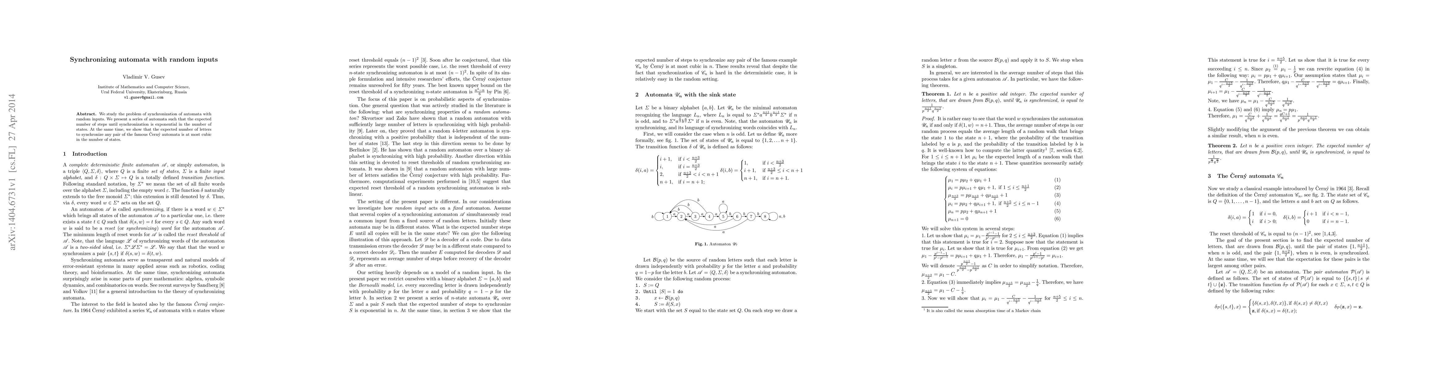 Summary: This paper investigates automata synchronization under random inputs, demonstrating that certain automata require exponential time for synchronization, while the Cerny automata synchronize in a time that is cubic in the number of states.