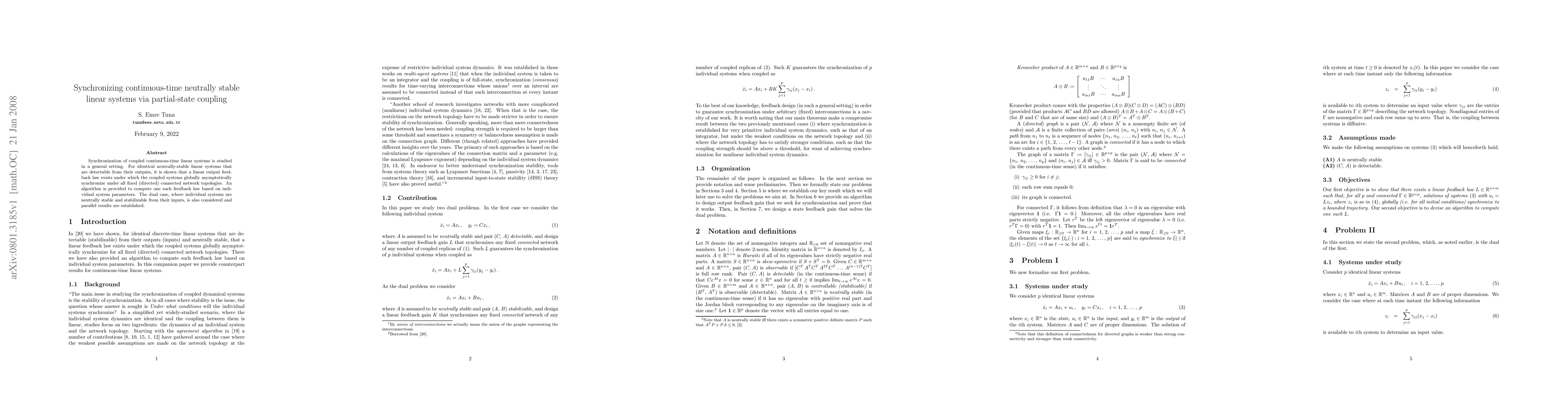 Synchronization of coupled continuous-time linear systems is studied in a general setting. For identical neutrally-stable linear systems that are detectable from their outputs, it is shown that a linear output feedback law exists under which the coupled systems globally asymptotically synchronize under all fixed (directed) connected network topologies. An algorithm is provided to compute one such feedback law based on individual system parameters. The dual case, where individual systems are neutrally stable and stabilizable from their inputs, is also considered and parallel results are established.