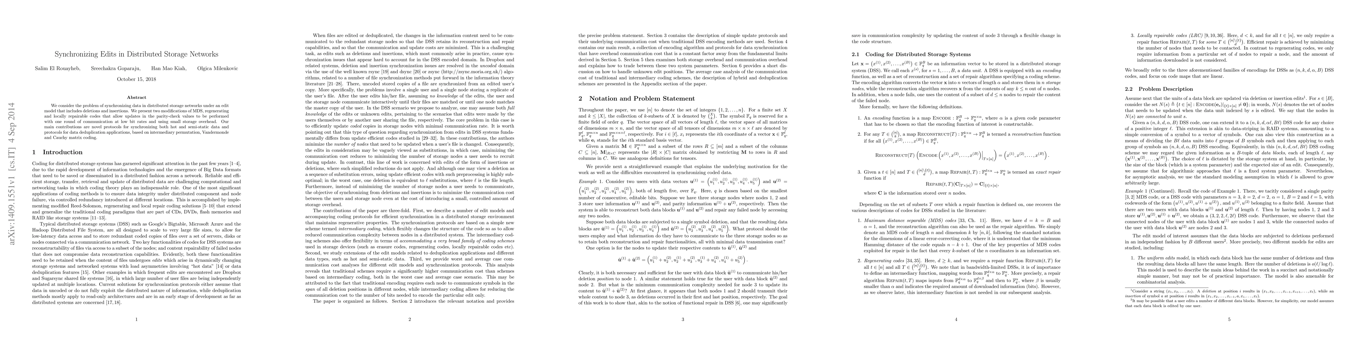 We consider the problem of synchronizing data in distributed storage networks under an edit model that includes deletions and insertions. We present two modifications of MDS, regenerating and locally repairable codes that allow updates in the parity-check values to be performed with one round of communication at low bit rates and using small storage overhead. Our main contributions are novel protocols for synchronizing both hot and semi-static data and protocols for data deduplication applications, based on intermediary permutation, Vandermonde and Cauchy matrix coding.