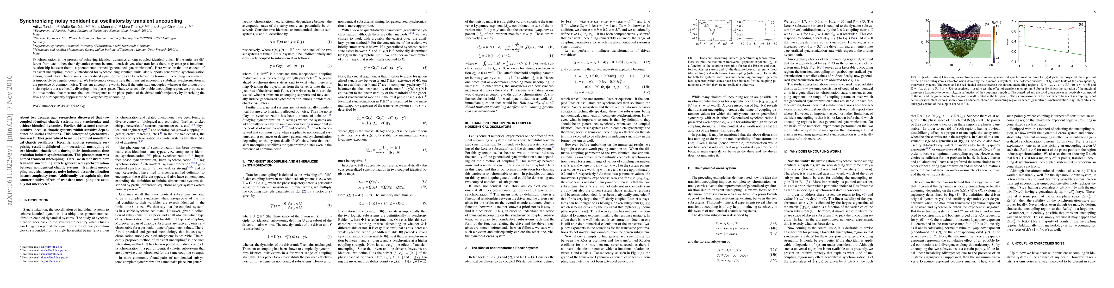 This paper demonstrates that transient uncoupling can achieve generalized synchronization among nonidentical chaotic oscillators, even when regular coupling fails. It shows that this method stabilizes synchronization under common noise and proposes a method to identify optimal uncoupling regions based on local divergence measurement.