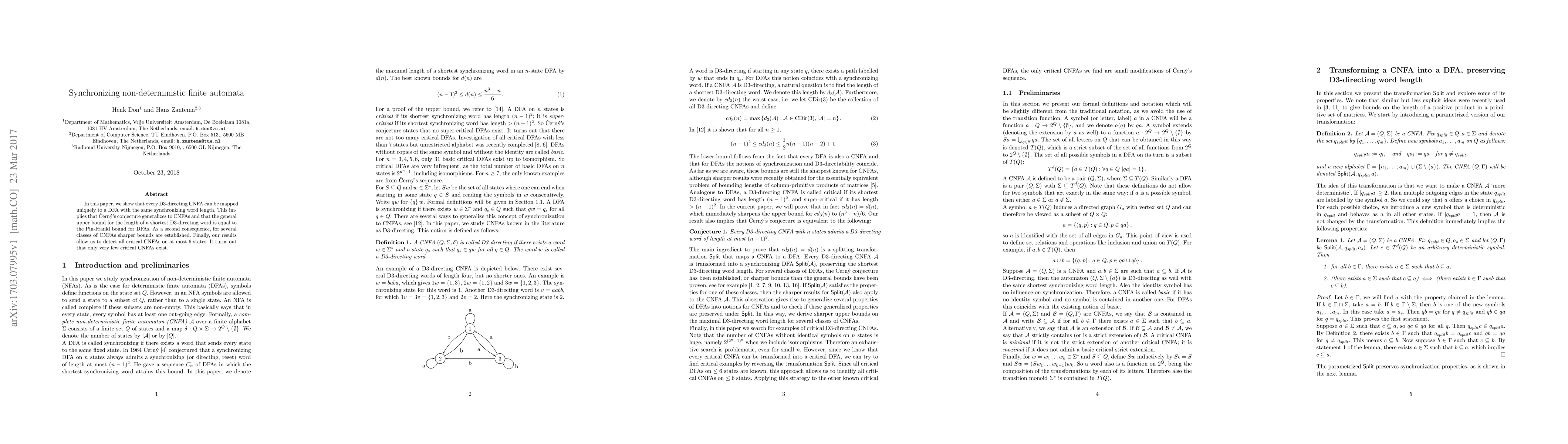 In this paper, we show that every D3-directing CNFA can be mapped uniquely to a DFA with the same synchronizing word length. This implies that \v{C}ern\'y's conjecture generalizes to CNFAs and that the general upper bound for the length of a shortest D3-directing word is equal to the Pin-Frankl bound for DFAs. As a second consequence, for several classes of CNFAs sharper bounds are established. Finally, our results allow us to detect all critical CNFAs on at most 6 states. It turns out that only very few critical CNFAs exist.