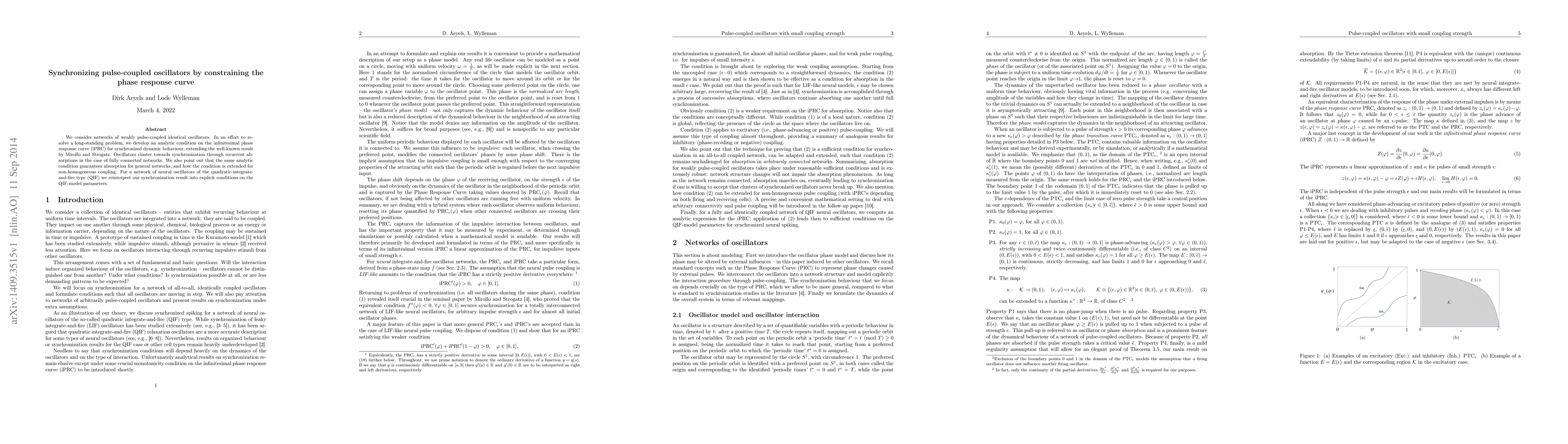 This paper develops an analytic condition on the infinitesimal phase response curve for synchronizing pulse-coupled oscillators, extending Mirollo and Strogatz's results. It shows that this condition ensures synchronization in both fully connected and general networks, even with non-homogeneous coupling, and provides explicit conditions for neural oscillators modeled by quadratic-integrate-and-fire dynamics.