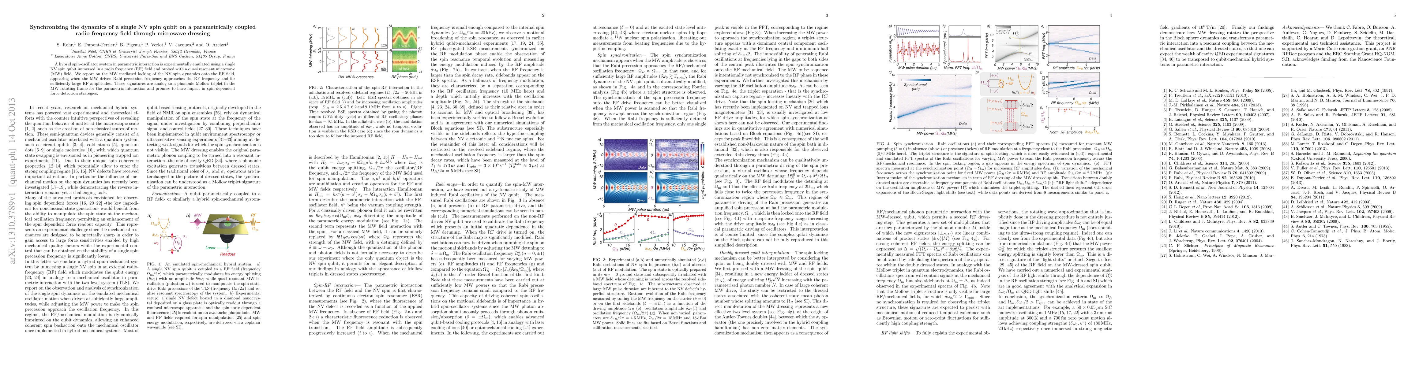 A hybrid spin-oscillator system in parametric interaction is experimentally emulated using a single NV spin qubit immersed in a radio frequency (RF) field and probed with a quasi resonant microwave (MW) field. We report on the MW mediated locking of the NV spin dynamics onto the RF field, appearing when the MW driven Rabi precession frequency approaches the RF frequency and for sufficiently large RF amplitudes. These signatures are analog to a phononic Mollow triplet in the MW rotating frame for the parametric interaction and promise to have impact in spin-dependent force detection strategies.