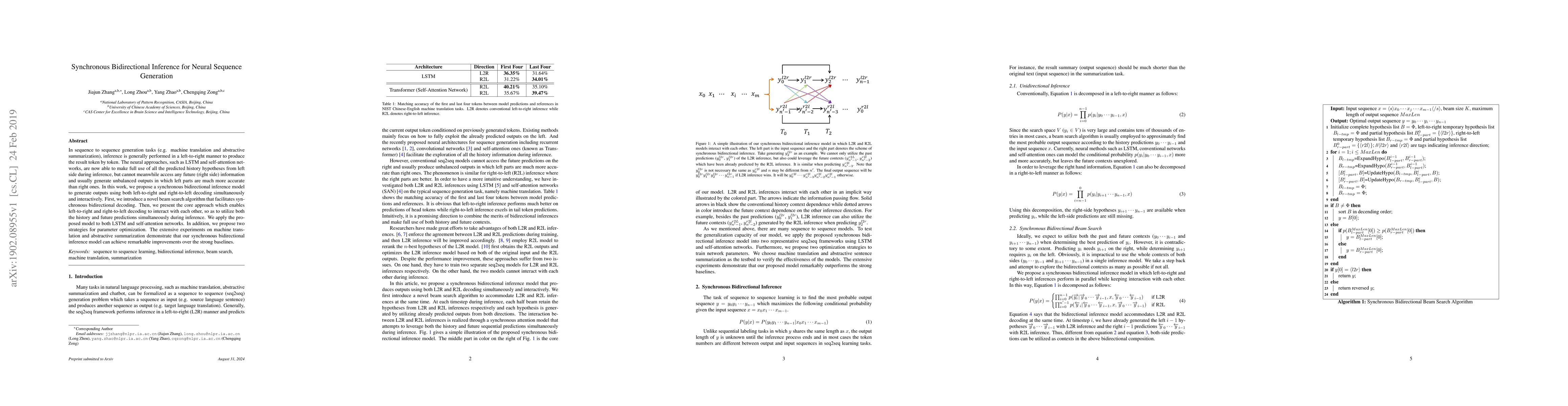 The paper proposes a synchronous bidirectional inference model for sequence generation tasks, utilizing both left-to-right and right-to-left decoding simultaneously and interactively. It introduces a novel beam search algorithm for synchronous bidirectional decoding and applies the model to LSTM and self-attention networks.