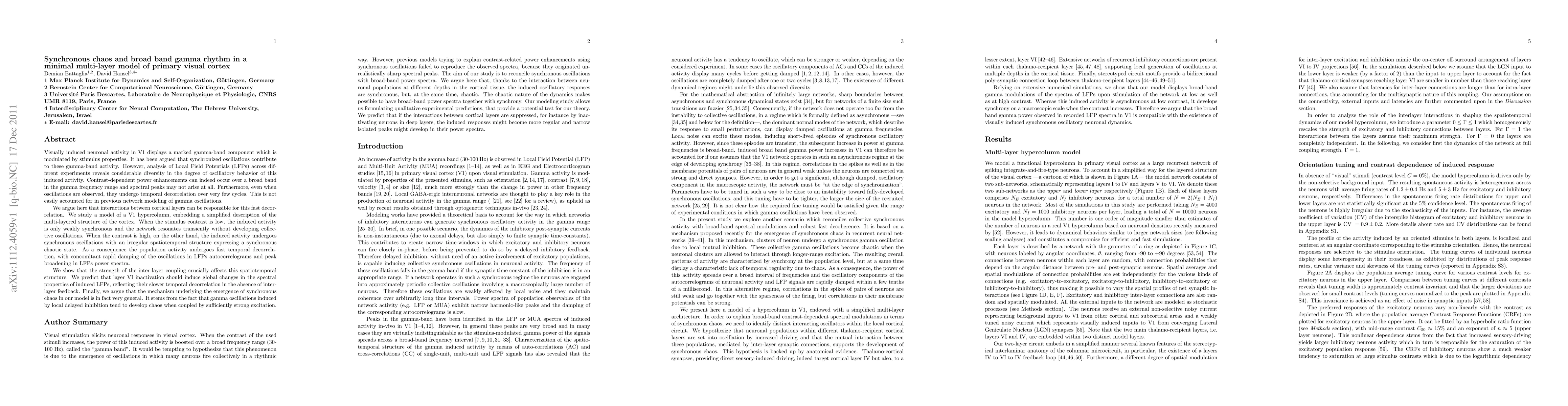 This paper explores how interactions between cortical layers in a minimal multi-layer model of primary visual cortex (V1) can lead to synchronous chaos and broad band gamma rhythm. The model demonstrates that high stimulus contrast induces synchronous oscillations, resulting in fast temporal decorrelation and rapid damping of oscillations.