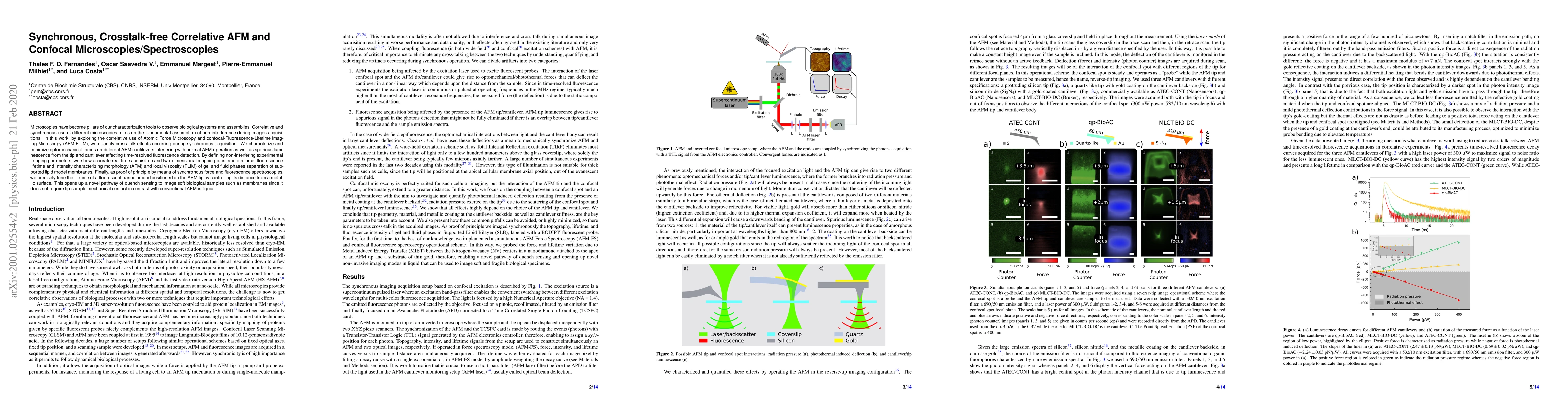 Microscopies have become pillars of our characterization tools to observe biological systems and assemblies. Correlative and synchronous use of different microscopies relies on the fundamental assumption of non-interference during images acquisitions. In this work, by exploring the correlative use of Atomic Force Microscopy and confocal-Fluorescence-Lifetime Imaging Microscopy (AFM-FLIM), we quantify cross-talk effects occurring during synchronous acquisition. We characterize and minimize optomechanical forces on different AFM cantilevers interfering with normal AFM operation as well as spurious luminescence from the tip and cantilever affecting time-resolved fluorescence detection. By defining non-interfering experimental imaging parameters, we show accurate real-time acquisition and two-dimensional mapping of interaction force, fluorescence lifetime and intensity characterizing morphology (AFM) and local viscosity (FLIM) of gel and fluid phases separation of supported lipid model membranes. Finally, as proof of principle by means of synchronous force and fluorescence spectroscopies, we precisely tune the lifetime of a fluorescent nanodiamond positioned on the AFM tip by controlling its distance from a metallic surface. This opens up a novel pathway of quench sensing to image soft biological samples such as membranes since it does not require tip-sample mechanical contact in contrast with conventional AFM in liquid.