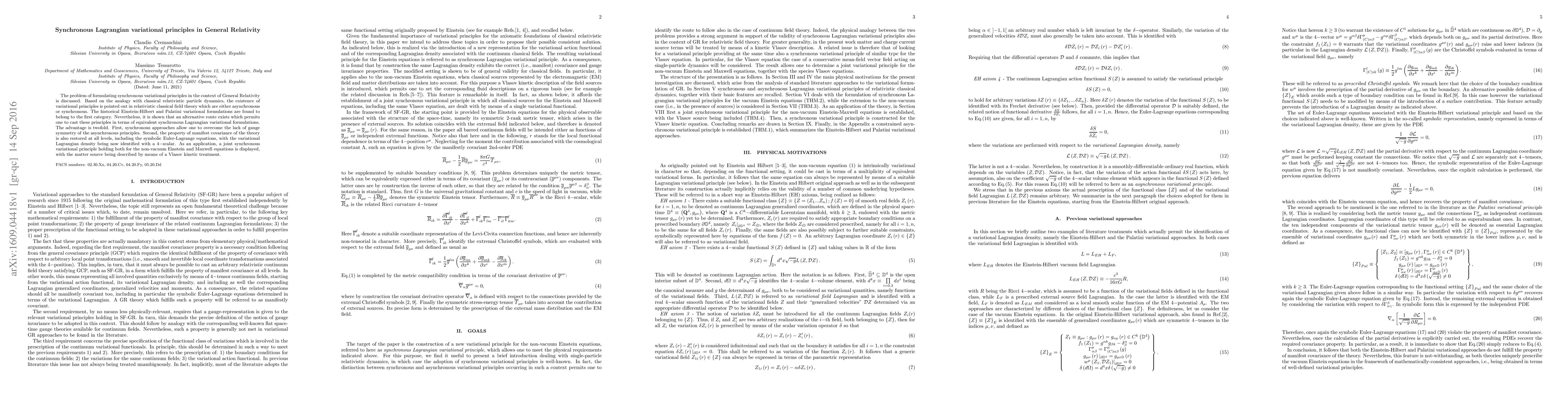 The problem of formulating synchronous variational principles in the context of General Relativity is discussed. Based on the analogy with classical relativistic particle dynamics, the existence of variational principles is pointed out in relativistic classical field theory which are either asynchronous or synchronous. The historical Einstein-Hilbert and Palatini variational formulations are found to belong to the first category. Nevertheless, it is shown that an alternative route exists which permits one to cast these principles in terms of equivalent synchronous Lagrangian variational formulations. The advantage is twofold. First, synchronous approaches allow one to overcome the lack of gauge symmetry of the asynchronous principles. Second, the property of manifest covariance of the theory is also restored at all levels, including the symbolic Euler-Lagrange equations, with the variational Lagrangian density being now identified with a $4-$scalar. As an application, a joint synchronous variational principle holding both for the non-vacuum Einstein and Maxwell equations is displayed, with the matter source being described by means of a Vlasov kinetic treatment.
