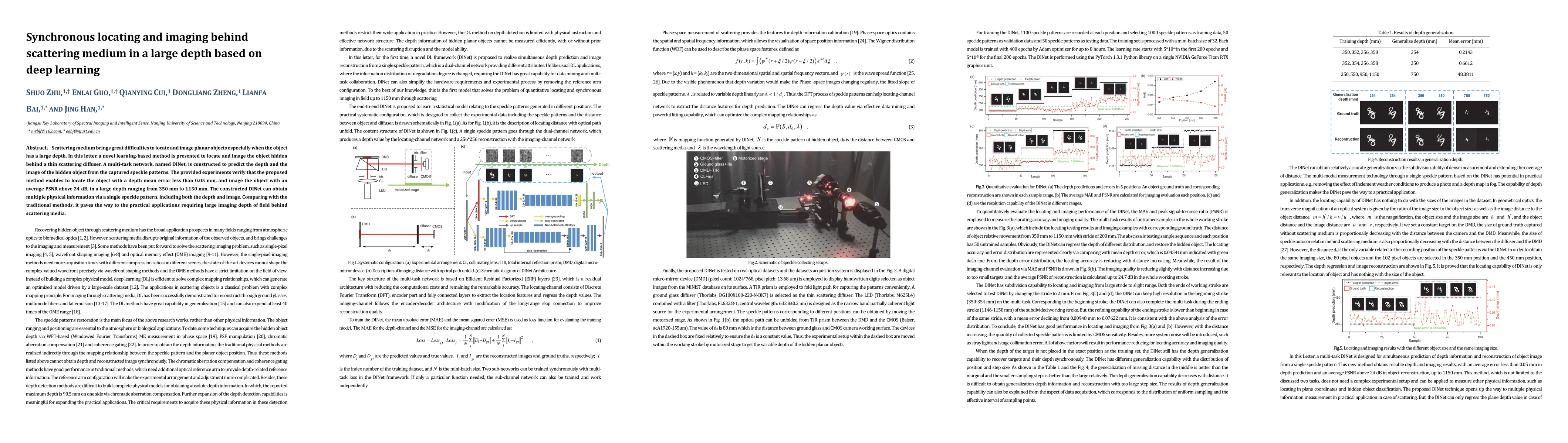 Scattering medium brings great difficulties to locate and image planar objects especially when the object has a large depth. In this letter, a novel learning-based method is presented to locate and image the object hidden behind a thin scattering diffuser. A multi-task network, named DINet, is constructed to predict the depth and the image of the hidden object from the captured speckle patterns. The provided experiments verify that the proposed method enables to locate the object with a depth mean error less than 0.05 mm, and image the object with an average PSNR above 24 dB, in a large depth ranging from 350 mm to 1150 mm. The constructed DINet can obtain multiple physical information via a single speckle pattern, including both the depth and image. Comparing with the traditional methods, it paves the way to the practical applications requiring large imaging depth of field behind scattering media.