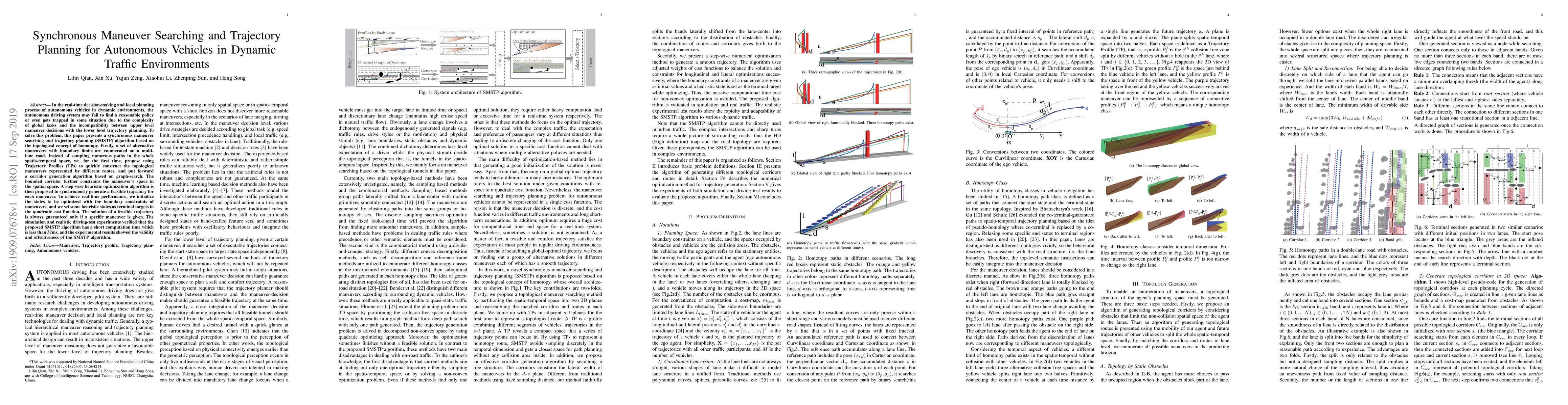 This paper introduces a synchronous maneuver searching and trajectory planning (SMSTP) algorithm for autonomous vehicles navigating dynamic traffic. The SMSTP algorithm employs homotopy concepts to enumerate alternative maneuvers and uses Trajectory Profiles to construct topological maneuvers, optimizing real-time performance with heuristic methods, achieving computation times under 37ms and demonstrating effectiveness through simulations and real-world tests.