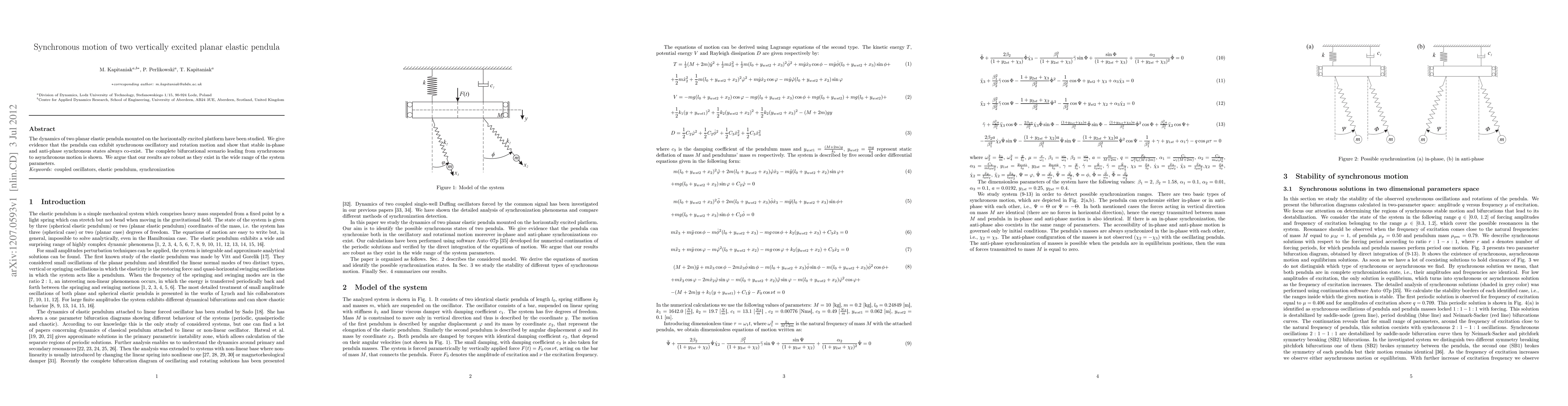 This study investigates the dynamics of two planar elastic pendula on a horizontally vibrating platform, demonstrating synchronous oscillatory and rotational motion, and revealing stable in-phase and anti-phase synchronous states, with a comprehensive bifurcational analysis showing the transition to asynchronous motion. The findings are robust across a wide range of system parameters.