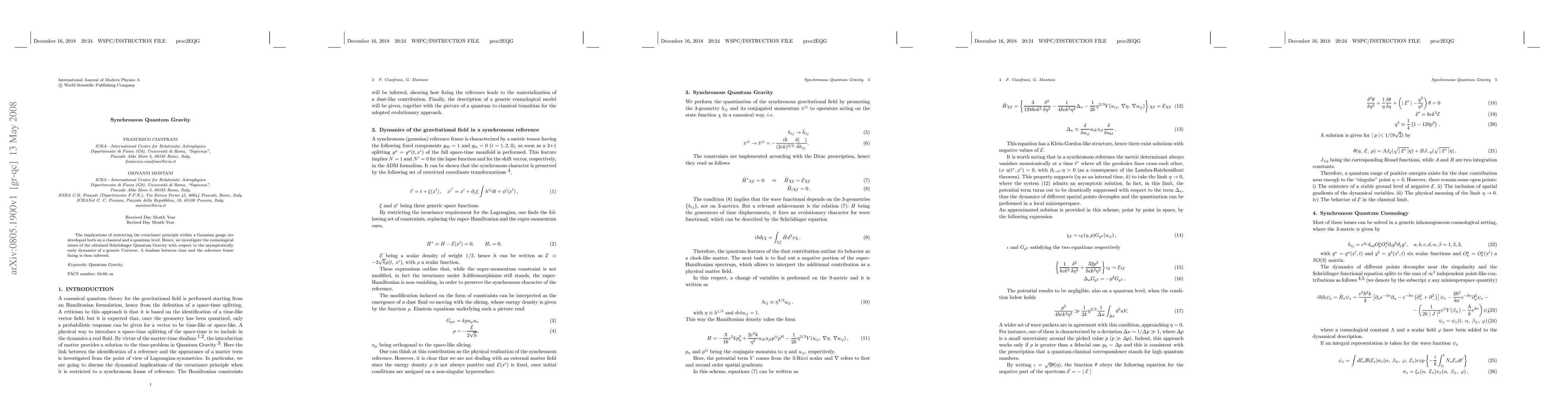The implications of restricting the covariance principle within a Gaussian gauge are developed both on a classical and a quantum level. Hence, we investigate the cosmological issues of the obtained Schr\"odinger Quantum Gravity with respect to the asymptotically early dynamics of a generic Universe. A dualism between time and the reference frame fixing is then inferred.