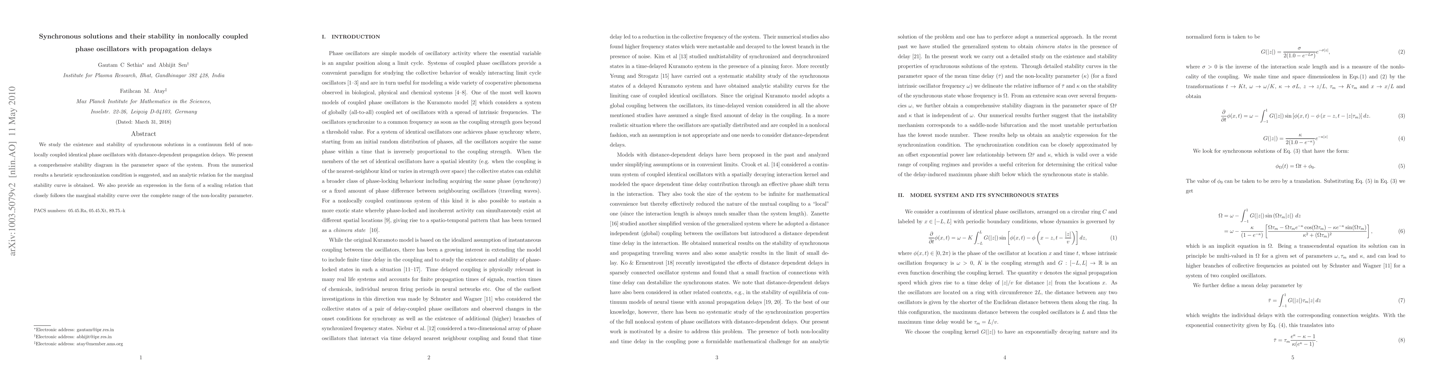 The paper presents a detailed stability analysis of synchronous solutions in non-locally coupled phase oscillators with propagation delays, providing both numerical and analytical results for the marginal stability curve.