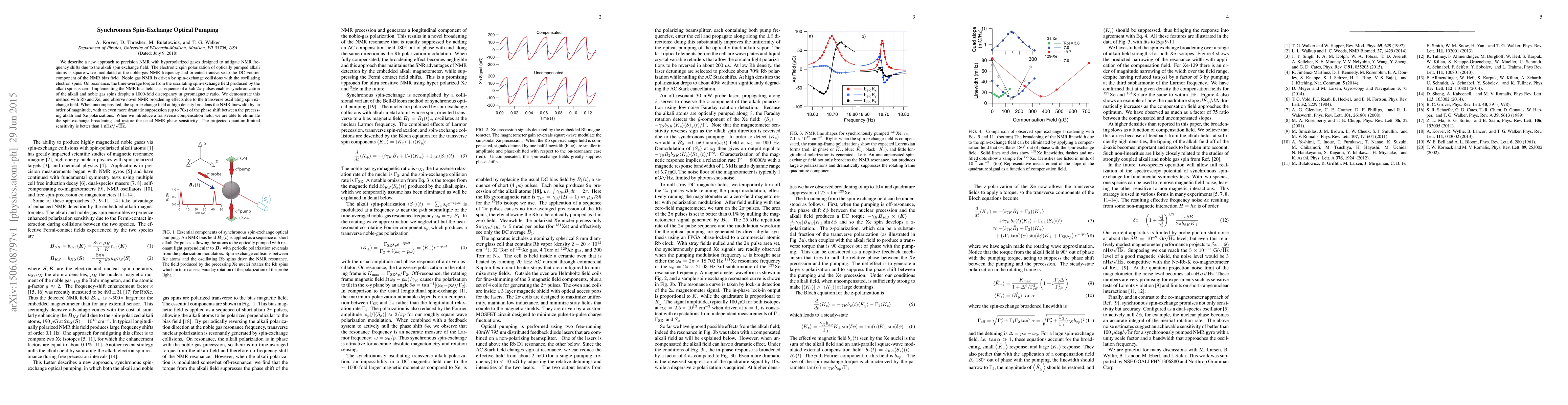 This paper introduces a novel method for precision NMR with hyperpolarized gases, utilizing synchronous spin-exchange optical pumping to mitigate frequency shifts caused by alkali spin exchange fields. The method employs a transverse oscillating spin-exchange field synchronized with alkali 2π pulses to achieve quantum-limited sensitivity, achieving up to 70x suppression of phase shifts and eliminating broadening effects with proper compensation.