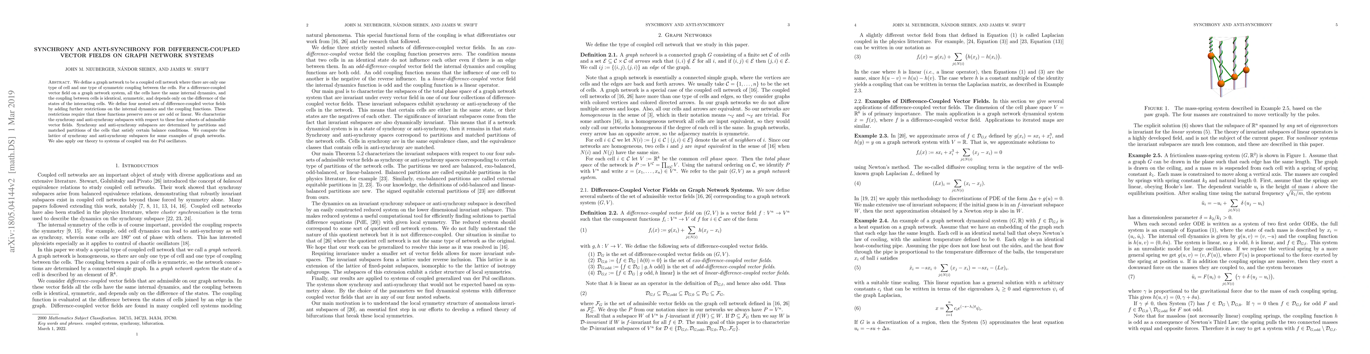 This paper explores synchrony and anti-synchrony in graph network systems with difference-coupled vector fields, defining nested sets of vector fields based on symmetry and coupling properties. It characterizes synchrony and anti-synchrony subspaces through partitions and computes their lattice structures for various networks, applying the theory to coupled van der Pol oscillators.