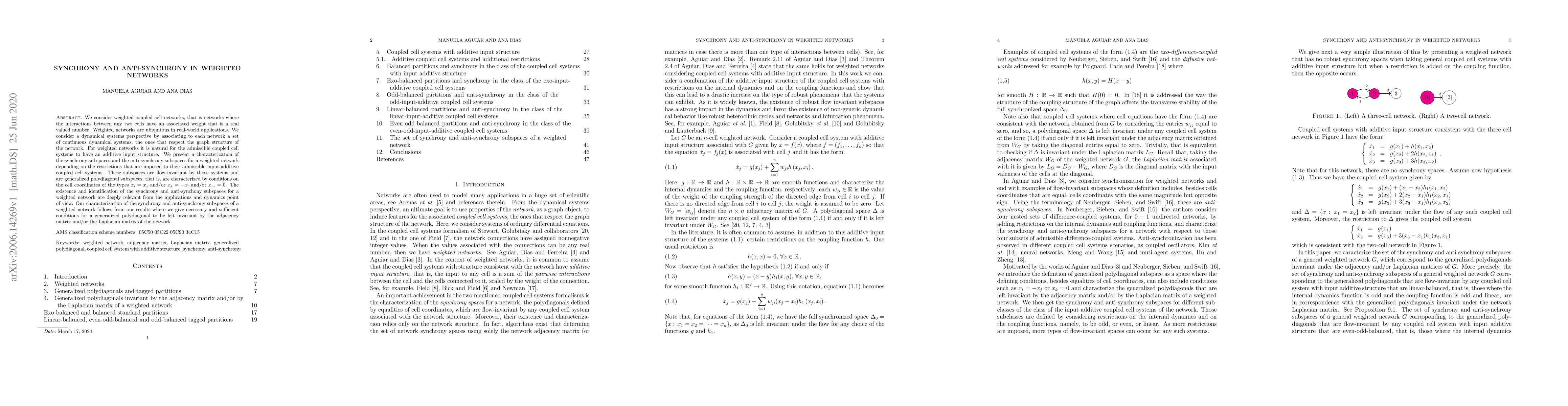This paper explores weighted coupled cell networks, characterizing synchrony and anti-synchrony subspaces based on the network's input-additive coupled cell systems. The study identifies generalized polydiagonal subspaces relevant for dynamics and applications, providing necessary and sufficient conditions for their invariance under network matrices.