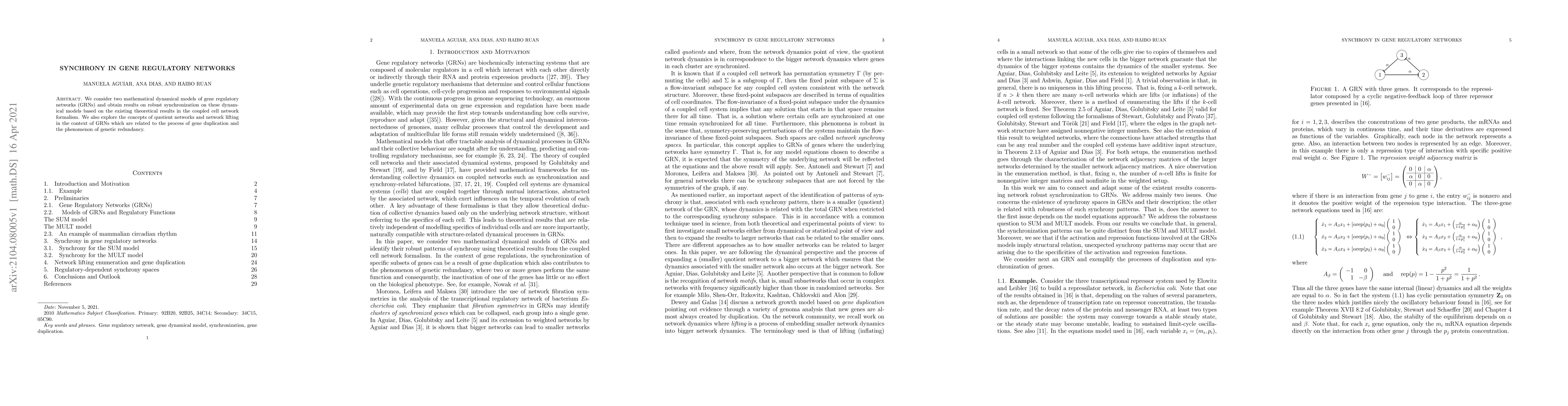 This paper investigates synchronization in gene regulatory networks (GRNs) using two mathematical dynamical models, focusing on robust synchronization and exploring quotient networks and network lifting related to gene duplication and genetic redundancy.