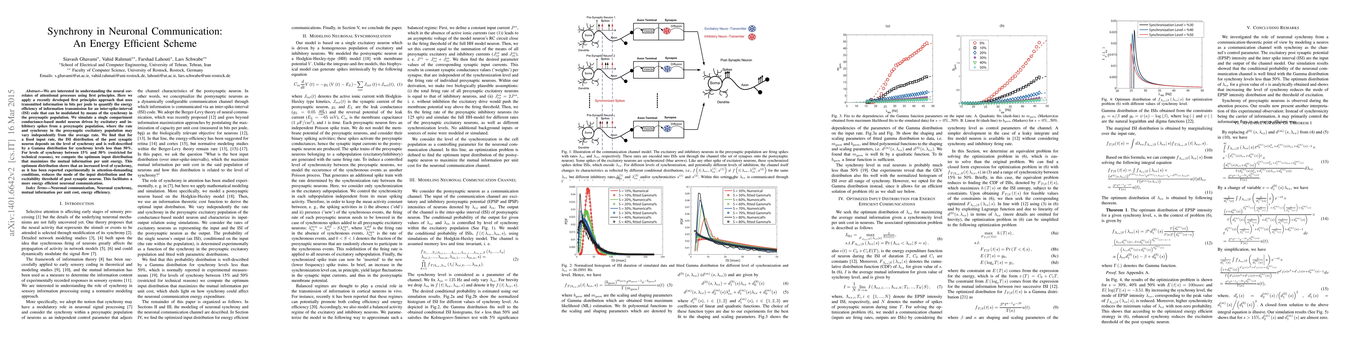This paper investigates the energy efficiency of neuronal communication using a first principles approach, focusing on how synchrony in presynaptic populations influences inter-spike-interval distributions. It finds that higher synchrony, especially in attention-demanding conditions, optimizes mutual information per unit energy, thereby enhancing energy efficiency in neuronal communication.