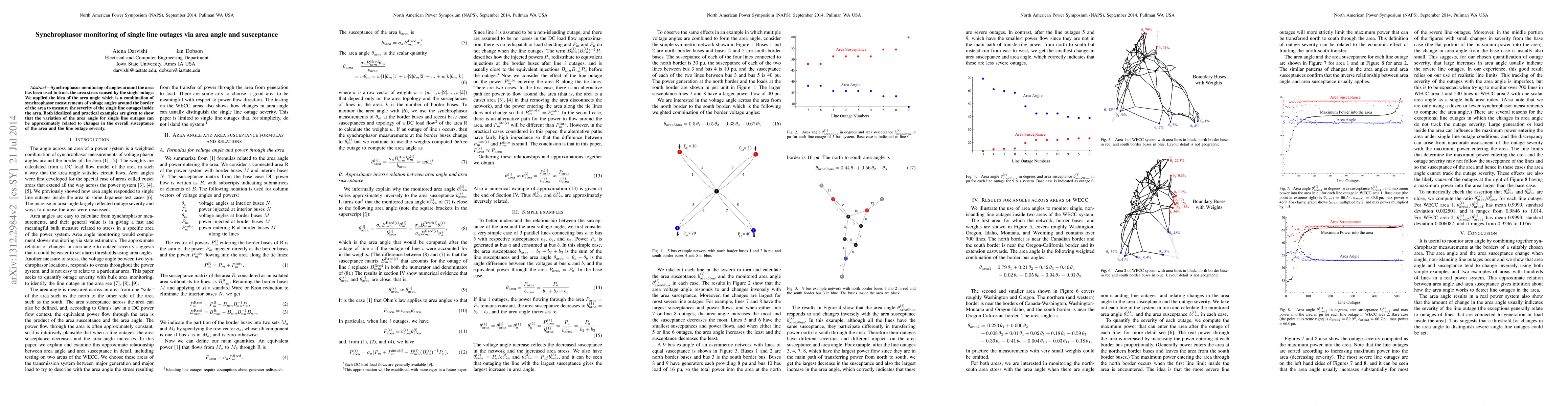 The area angle is a scalar measure of power system area stress that responds to line outages within the area and is a combination of synchrophasor measurements of voltage angles around the border of the area. Both idealized and practical examples are given to show that the variation of the area angle for single line outages can be approximately related to changes in the overall susceptance of the area and the line outage severity.