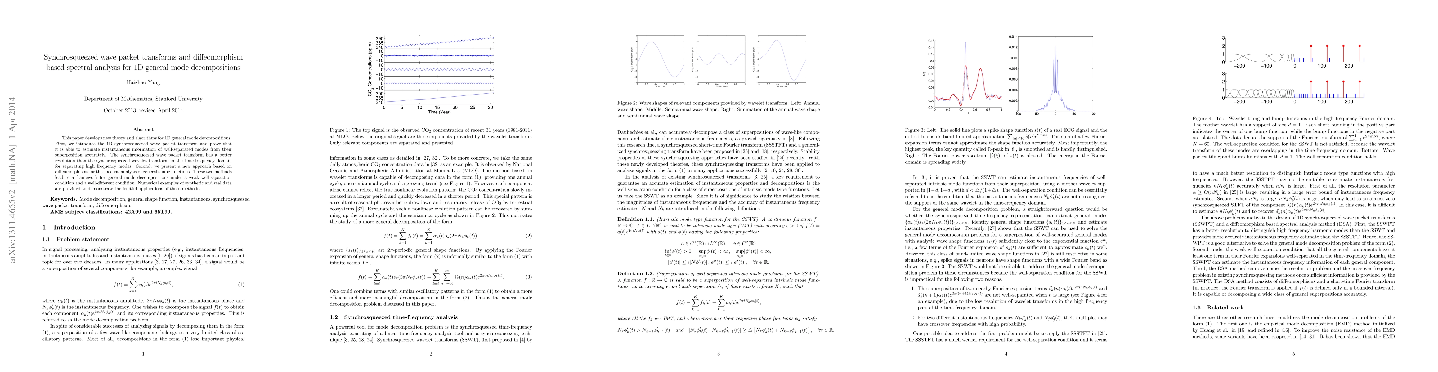 This paper develops a 1D synchrosqueezed wave packet transform for accurate estimation of instantaneous mode information and introduces a diffeomorphism-based spectral analysis method for general mode decompositions, demonstrating their effectiveness through synthetic and real data examples.