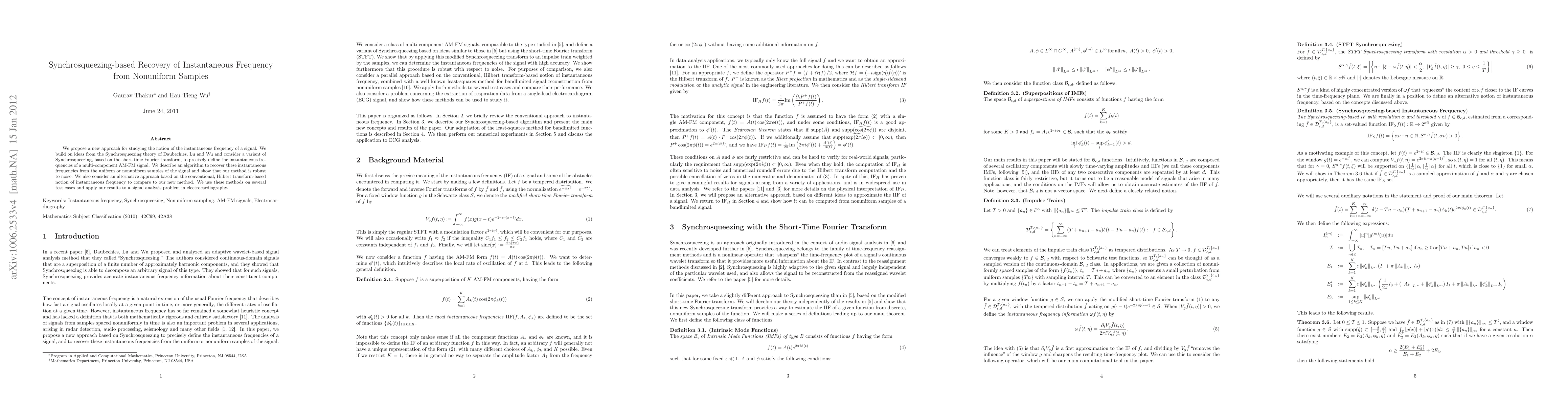 This paper proposes a novel Synchrosqueezing-based method to accurately recover instantaneous frequencies from both uniform and nonuniform samples of multi-component AM-FM signals, demonstrating robustness to noise and comparing it with the traditional Hilbert transform-based approach. The method is applied to electrocardiography signal analysis.