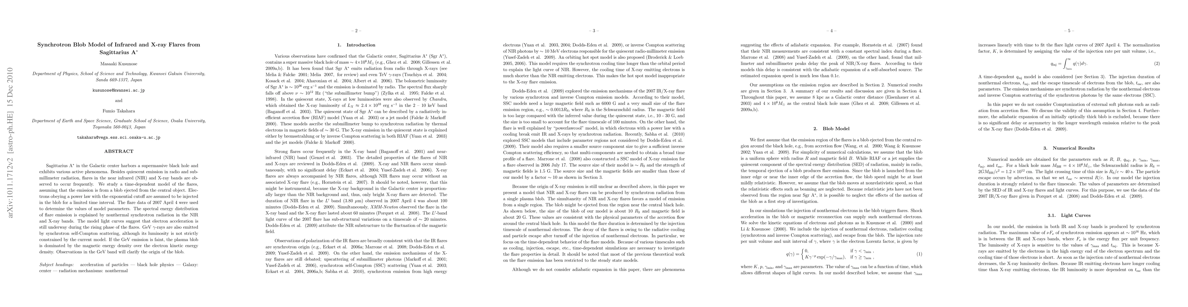 This paper proposes a synchrotron blob model to explain the infrared and X-ray flares from Sagittarius A* in the Galactic center, attributing the emission to a blob ejected from the supermassive black hole. The model suggests ongoing electron acceleration during the flare's rising phase and predicts GeV gamma-ray emission from synchrotron self-Compton scattering, with future observations needed to determine the blob's energy dominance.