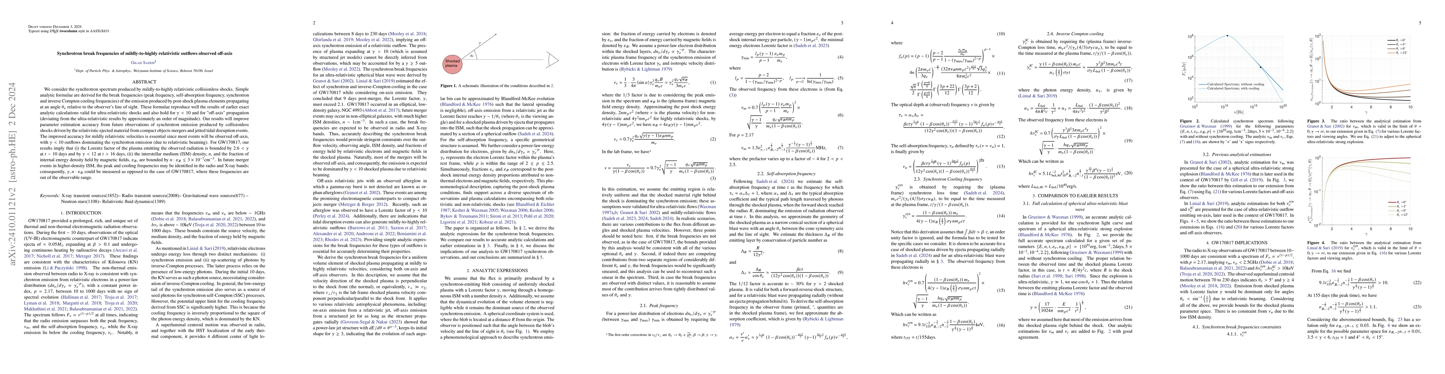 This research derives analytic expressions for the synchrotron break frequencies of mildly-to-highly relativistic outflows observed off-axis, enhancing parameter estimation from future observations of synchrotron emission from relativistic shocks. The results provide insights into the Lorentz factor and ISM density for events like GW170817 and suggest measurable parameters for future merger events in denser environments.